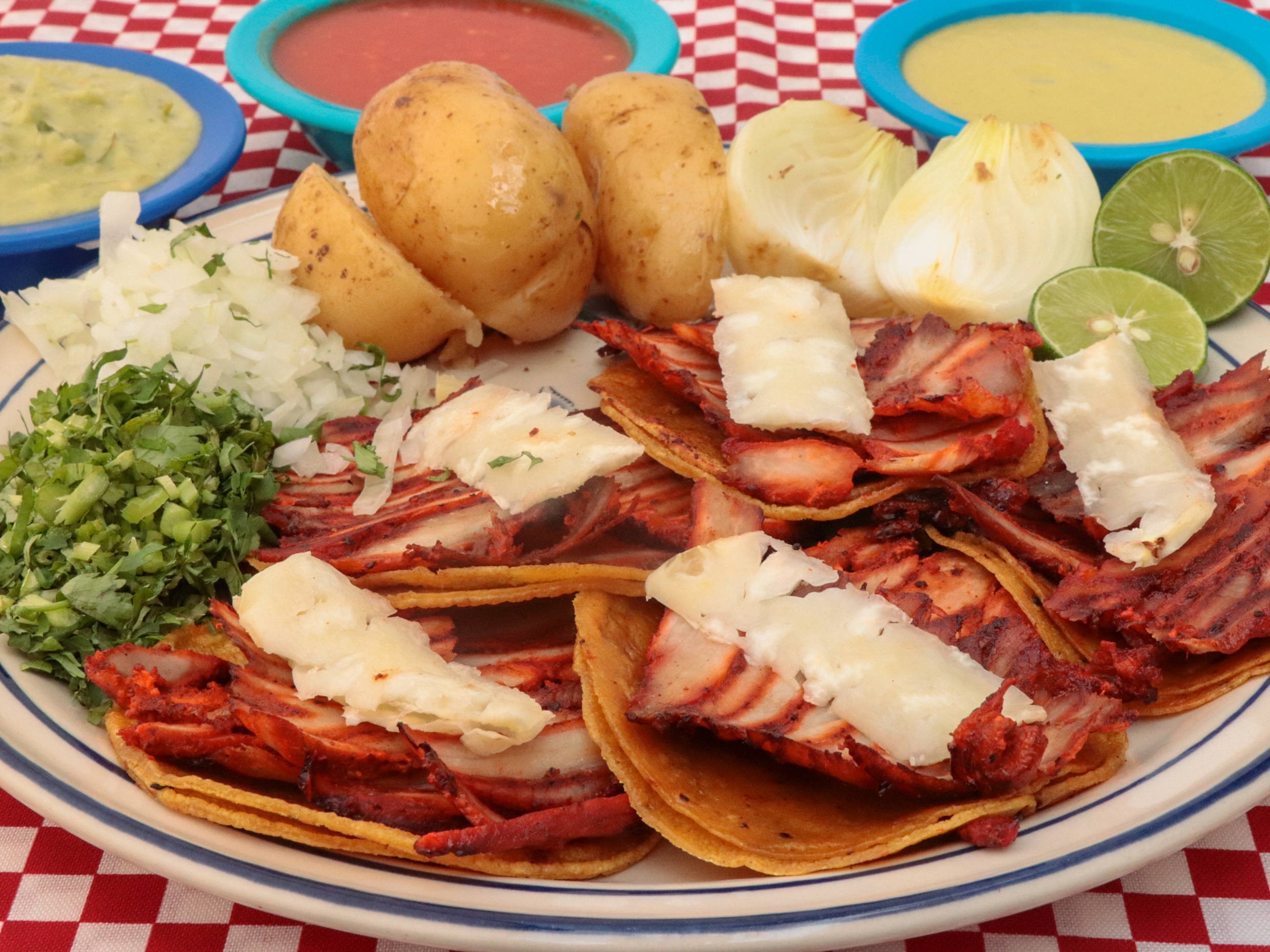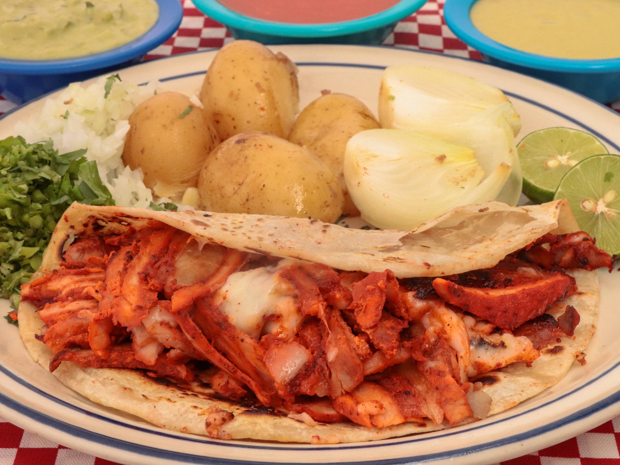 Trompo con queso en tortilla de harina, papa galeana, cebollitas cambray.