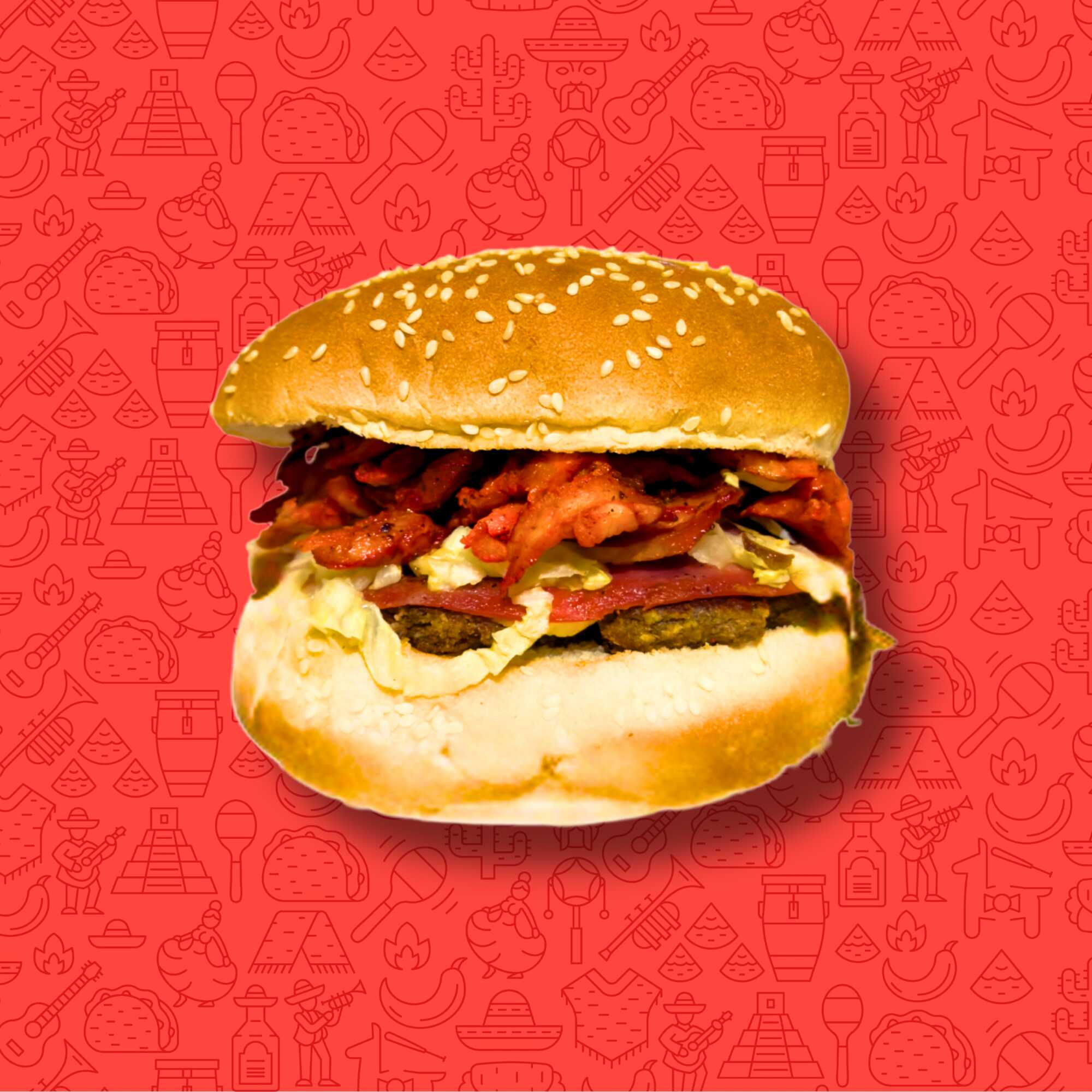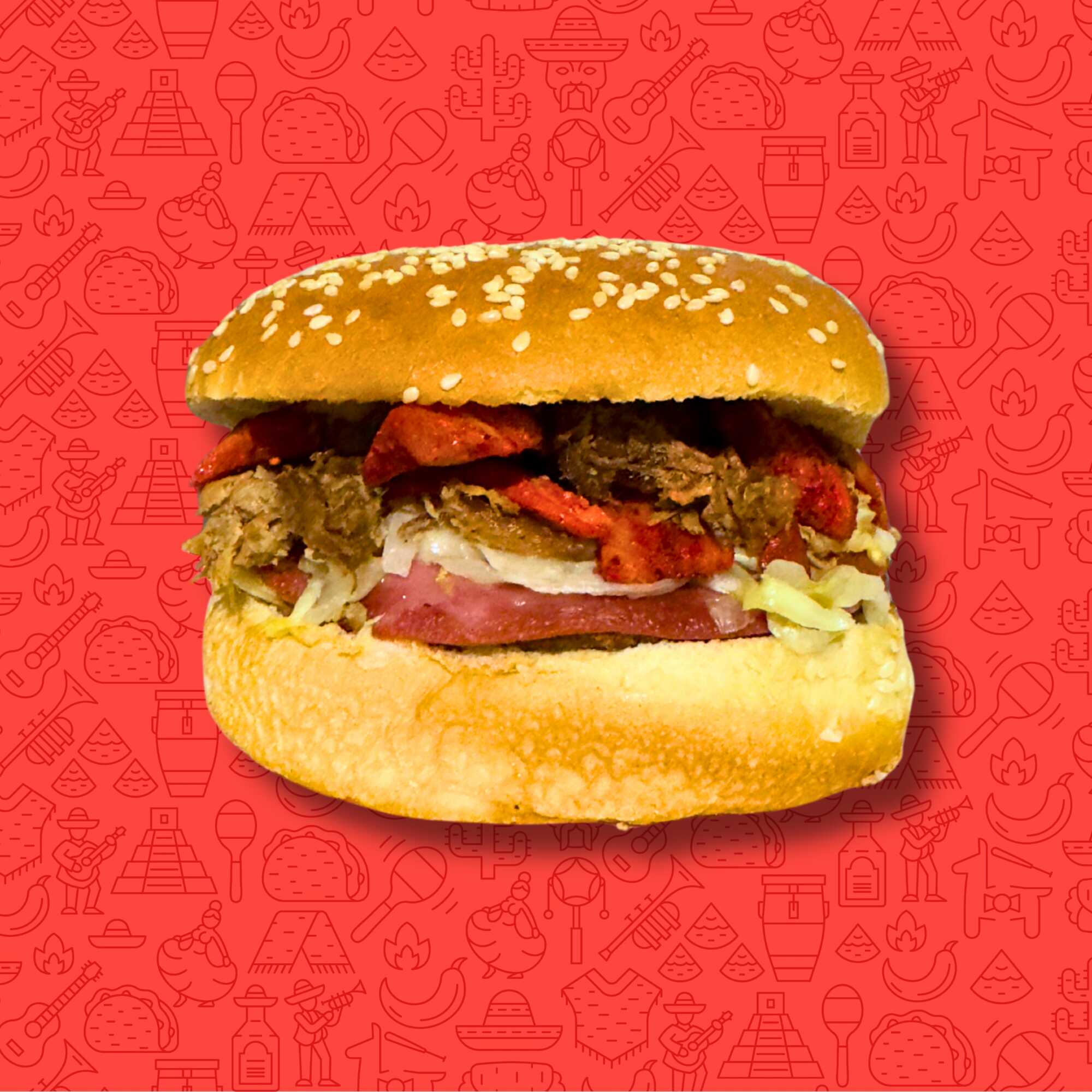 Pan Bimbollo, carne de hamburguesa casera, carne de trompo, queso chihuahua, jamón salami, aguacate, lechuga y aderezos.