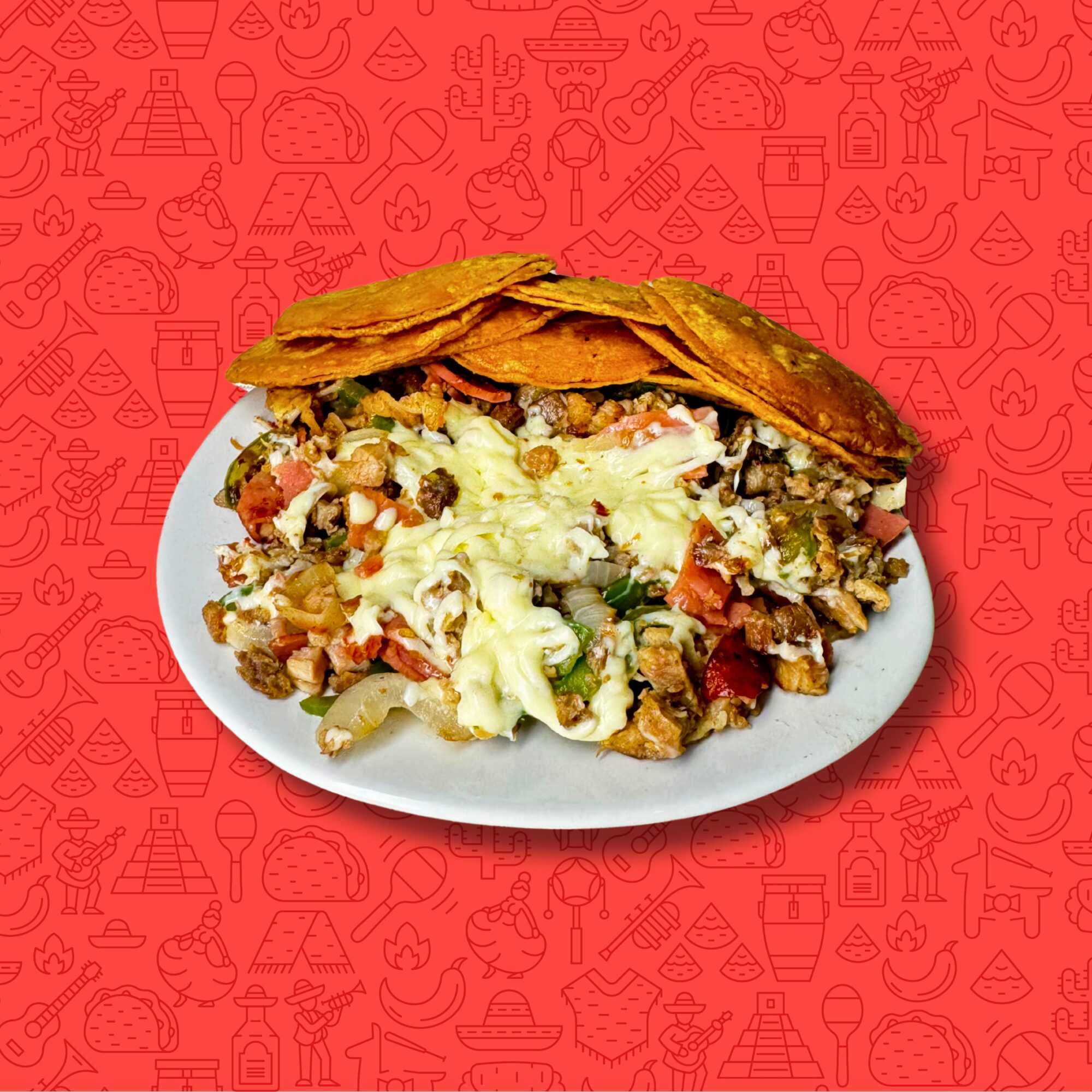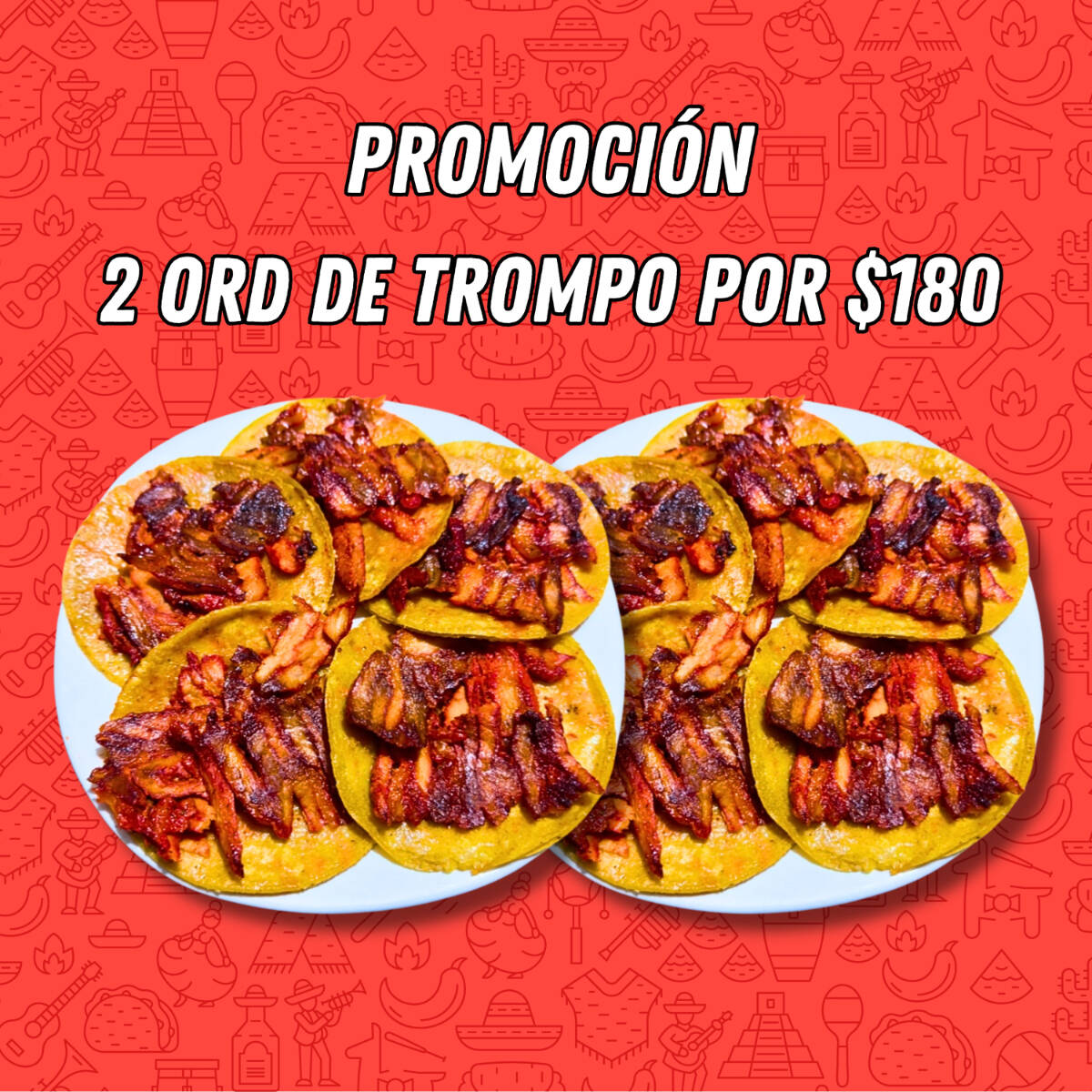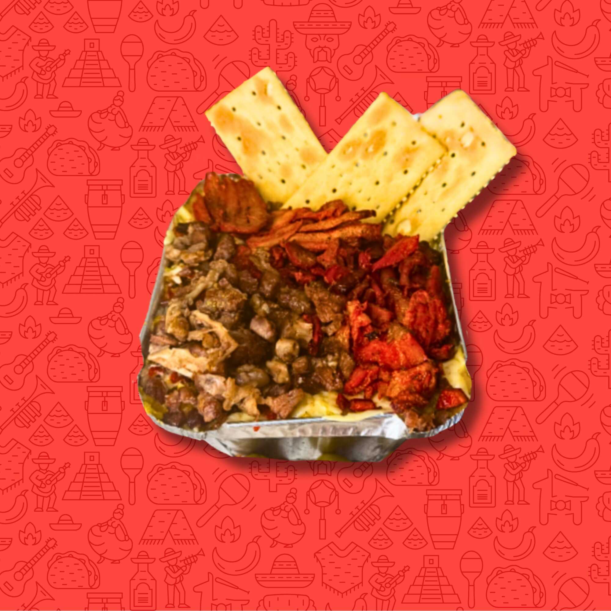 Carne de trompo, carne de bistec, morrón, cebolla, jamón, queso asadero, 10 tortillas de maíz, verduras, salsa, limones.