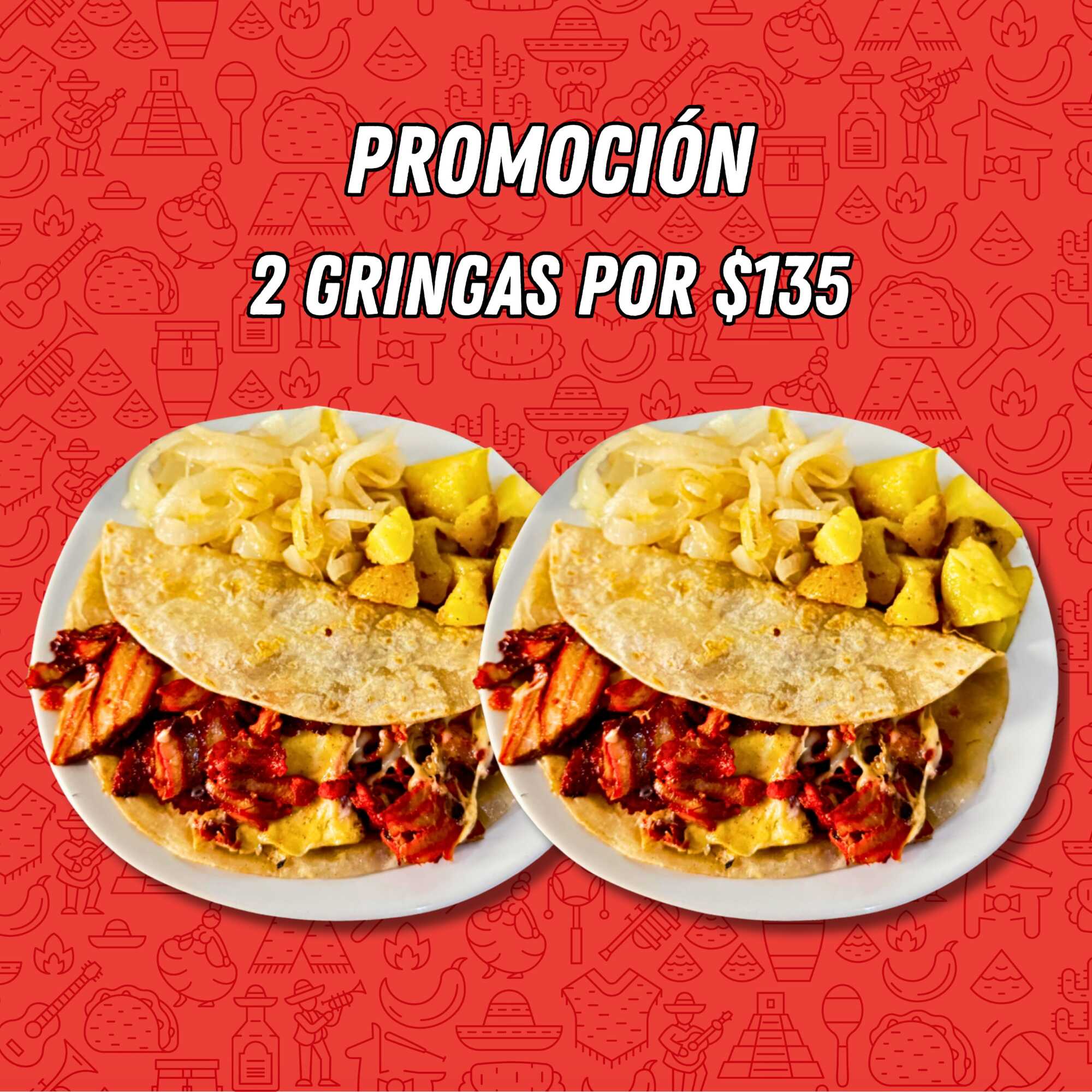 2 Tacos de Gringas de 18 cm, con queso chihuahua, acompañado de papa, cebolla, salsa y limones.