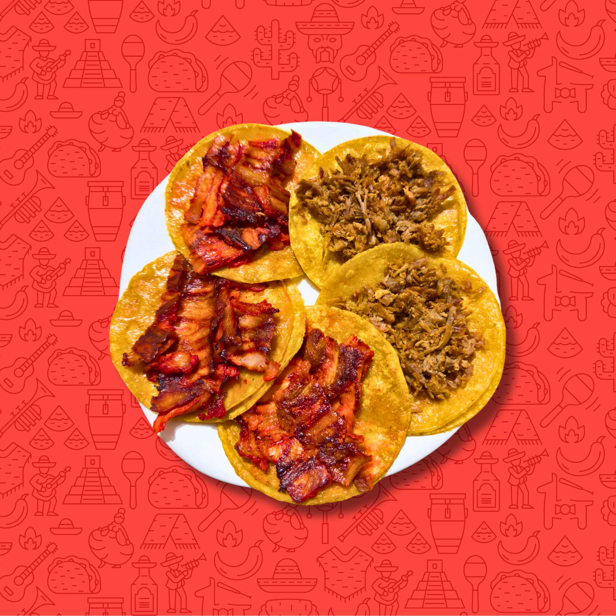 3 Tacos de trompo, y 2 tacos de bistec, acompañados con cebolla, papa galeana, limón, verdura y salsa.