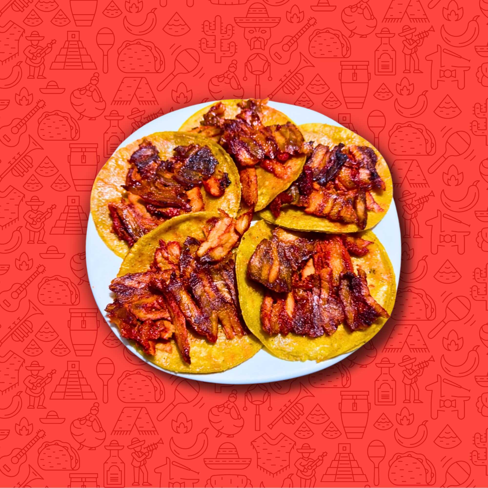 5 Tacos de trompo, acompañados con cebolla, papa galeana, limón, verdura y salsa.