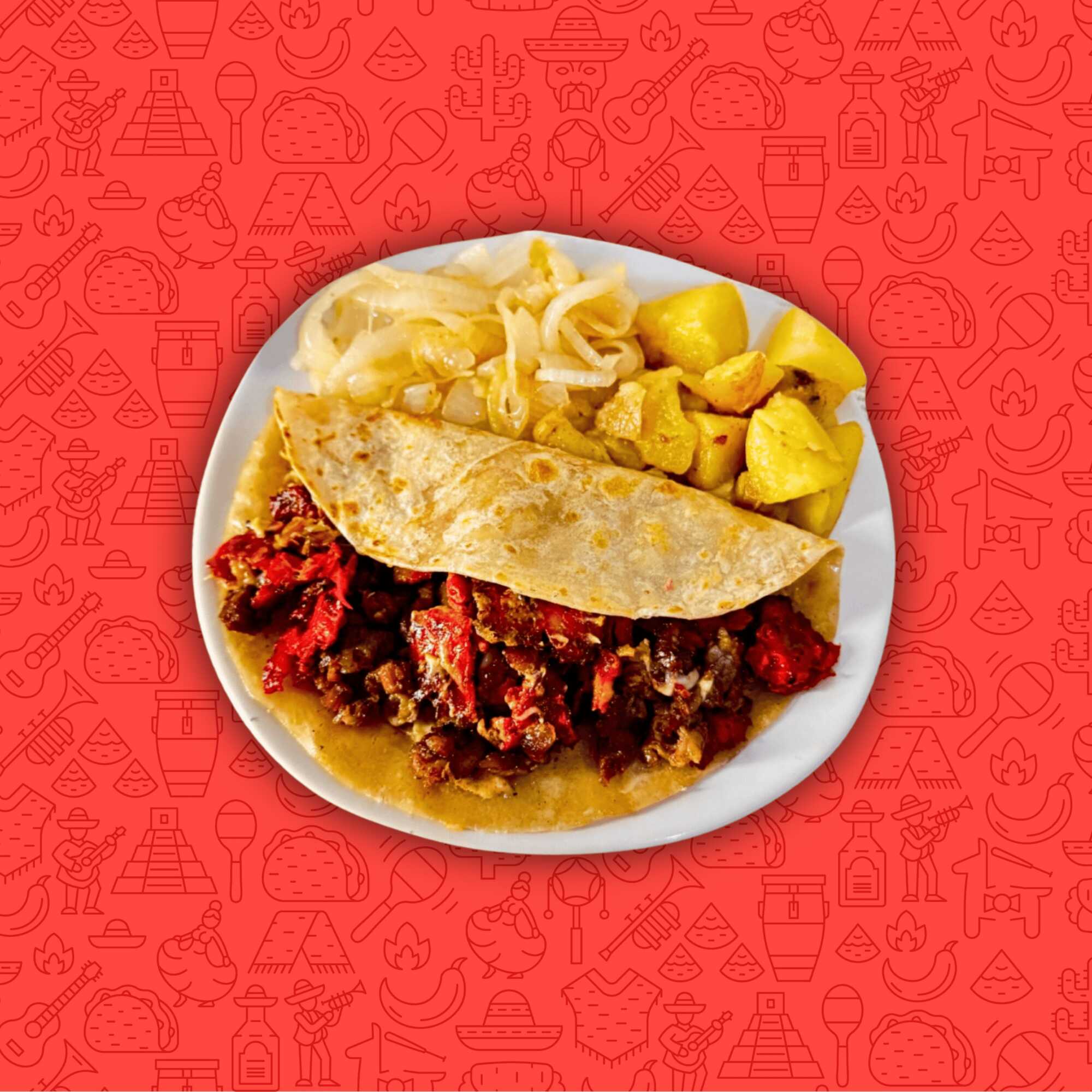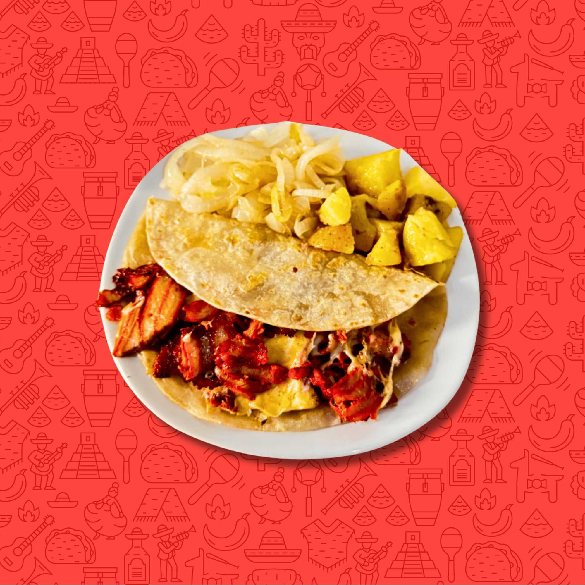 Un taco de harina de 18 cm con trompo, queso chihuahua, acompañado de cebolla, papa galeana, limón, verdura y salsa.