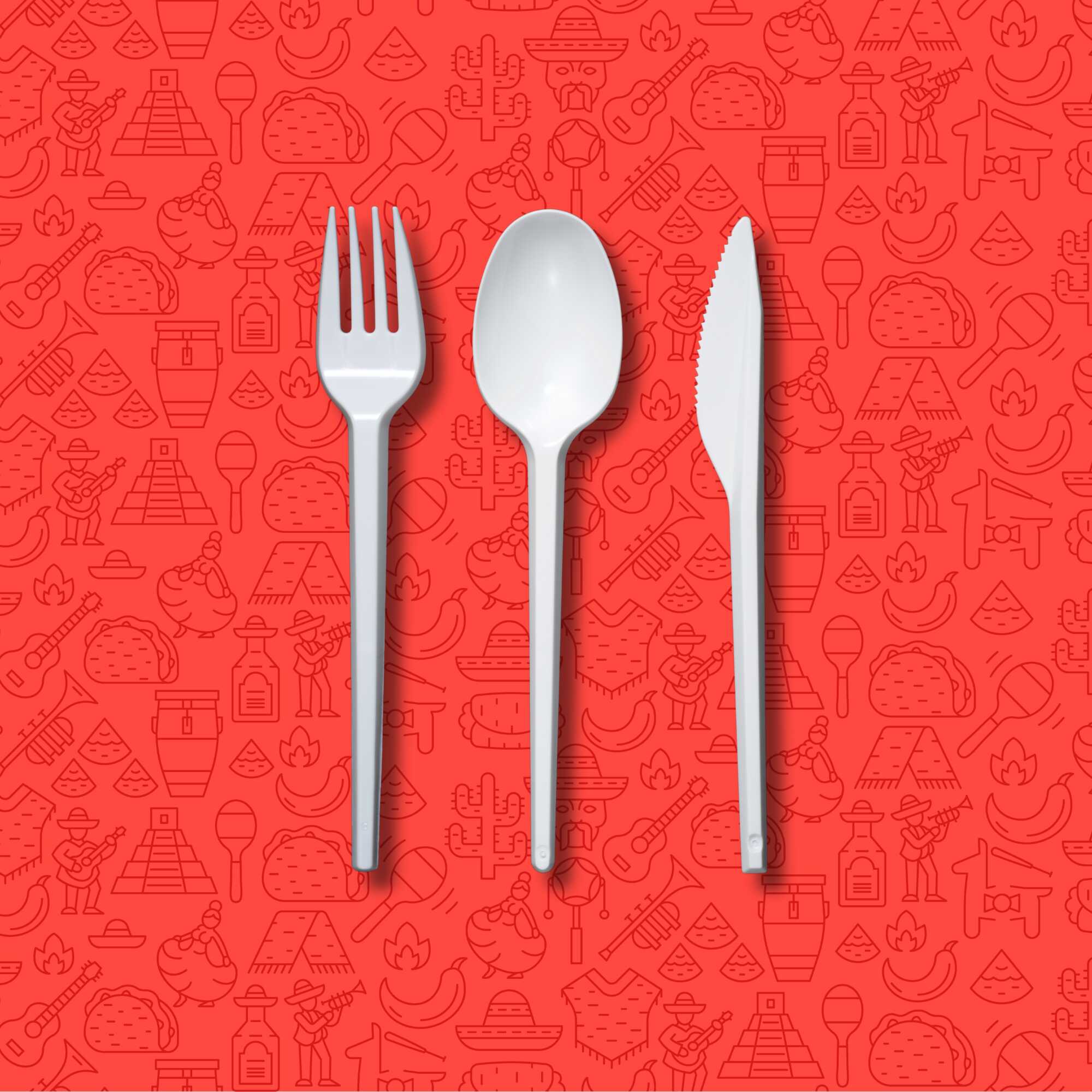 Cubiertos: cuchara, tenedor y cuchillo de plástico.