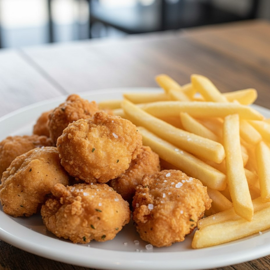 Un kilo de boneless crudos dorados y fritos con pequeña porción de papas naturales fritas