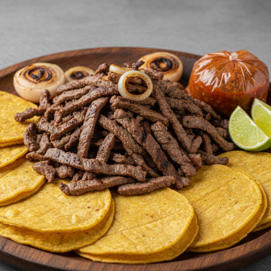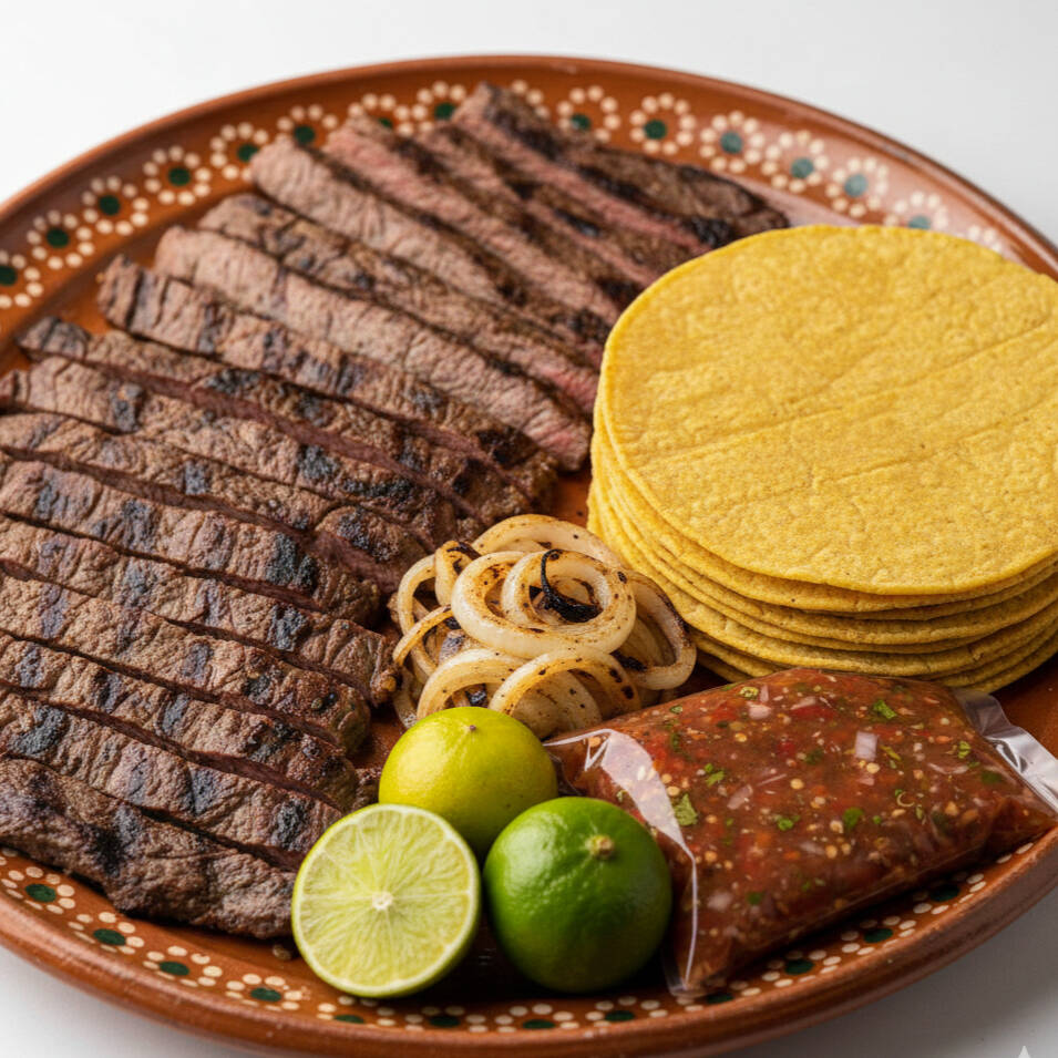 Un kilo crudo de carne de arrachera cocida a la plancha incluye; tortillas amarillas, salsa, cebolla asada y limón.
