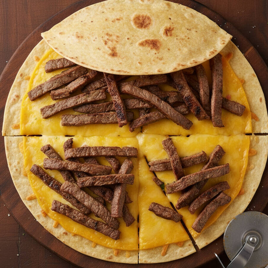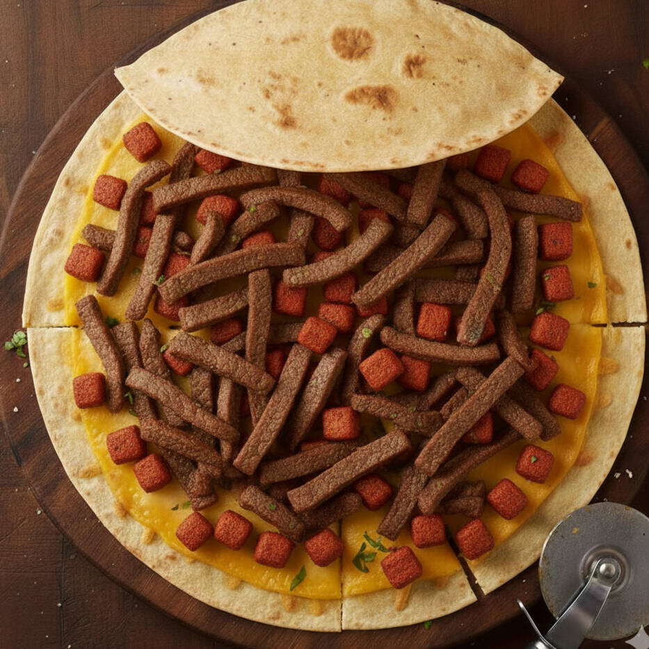 Tortilla de Harina con carne queso y otra tortilla.