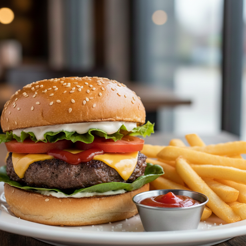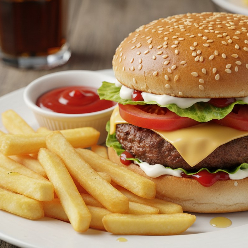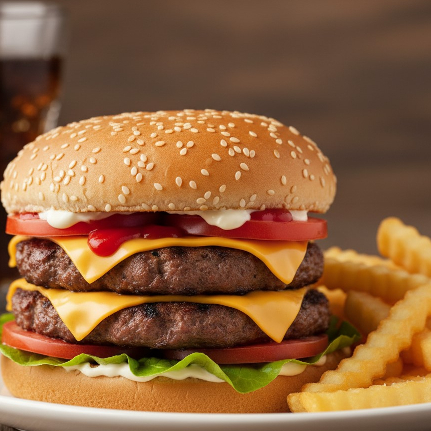 Pan de ajonjolí con carne Doblé , queso amarillo con lechuga, tómate, mayonesa, cátsup y pequeña porción de papas naturales fritas.