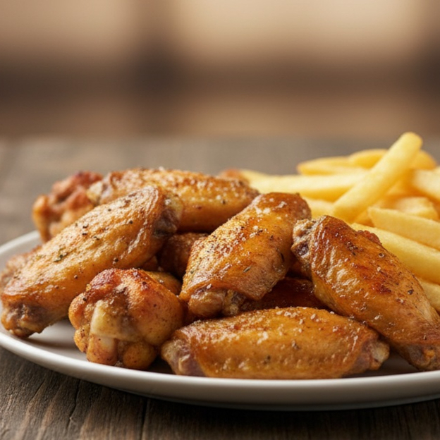 Orden individual de alitas doradas y fritas, con pequeña porción de papas naturales a la francesa fritas.