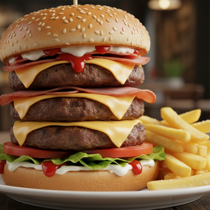 Pan de ajonjolí con 3 carnes lechuga, tómate, queso amarillo, mayonesa y cátsup.