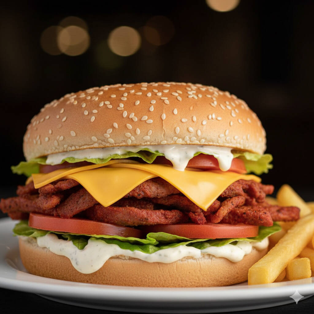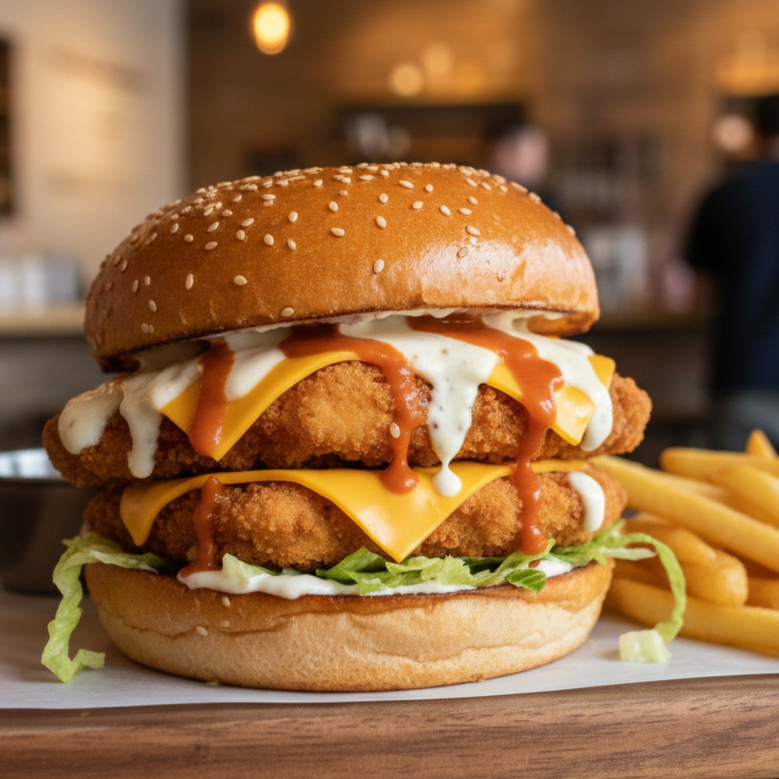 Pan de ajonjolí con boneless lechuga, tómate, queso amarillo, queso ranch.