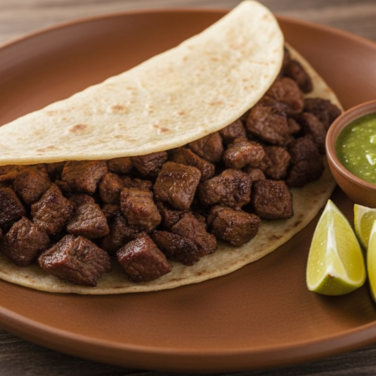 Tortilla de harina, con carne de bistec salsa y limón.