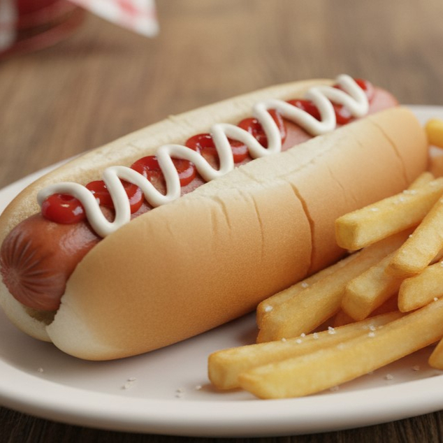 Pan de hot dog con salchicha sencillo con mayonesa, cátsup y pequeña porción de papas naturales fritas.