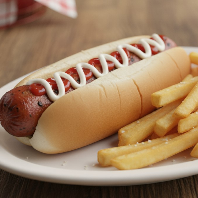 Pan de hot dog con salchicha de polaca, mayonesa, cátsup y pequeña porción de papas fritas.