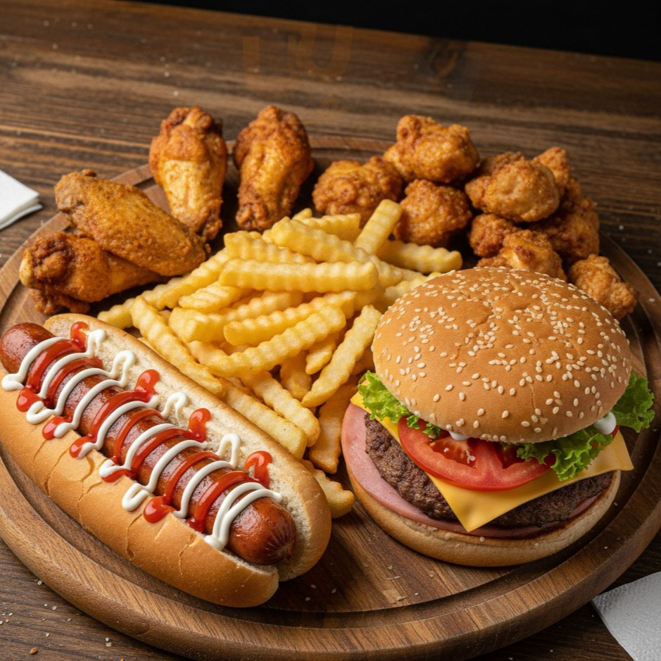 Porciones individuales sencillas como 1 orden de alitas , 1 orden de boneless, 1 hotdog , 1 hamburguesa y una porción de papas naturales fritas.