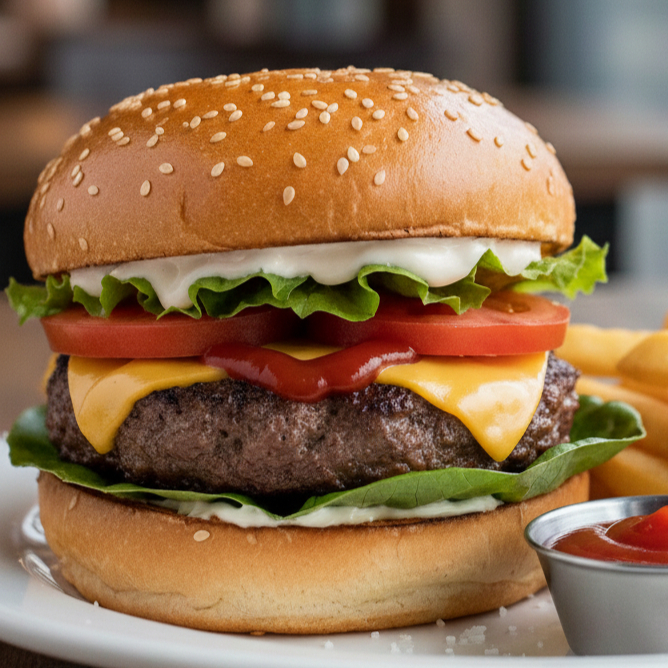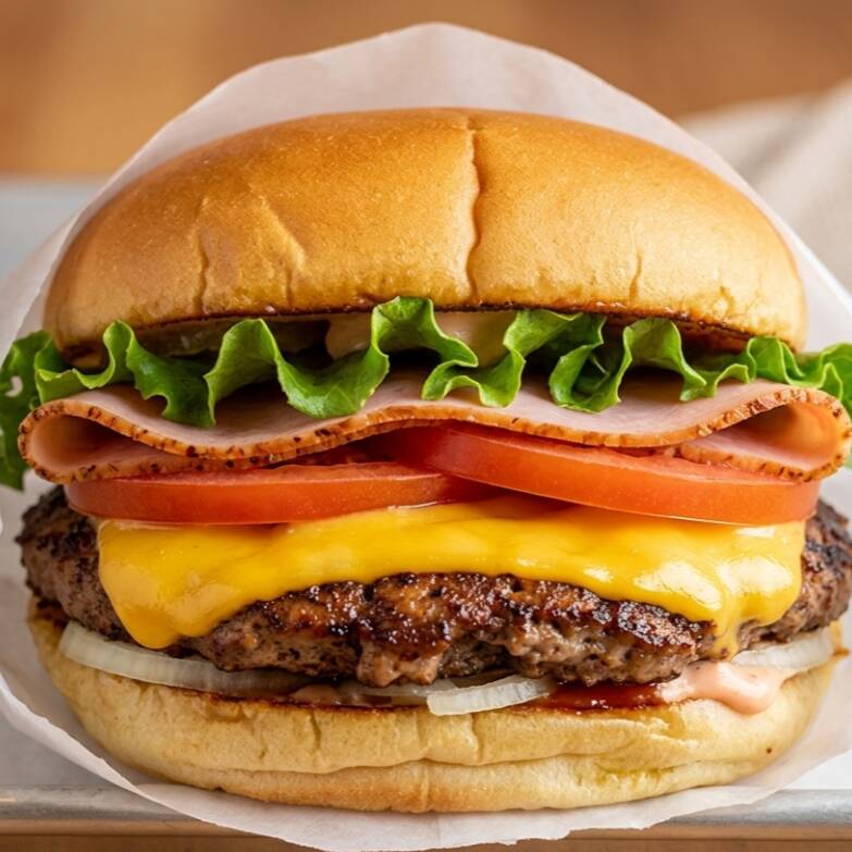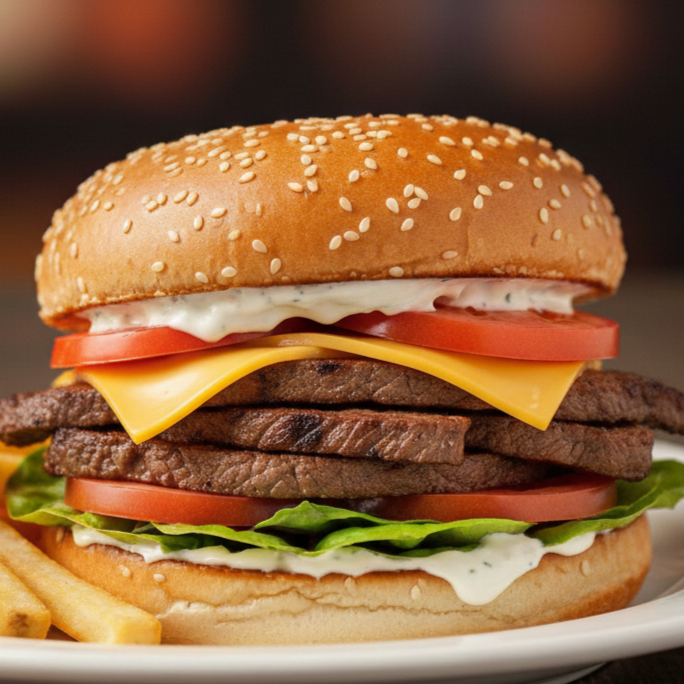 Pan de Hamburguesa con 3 carnes, lechuga, queso amarillo, ranch.