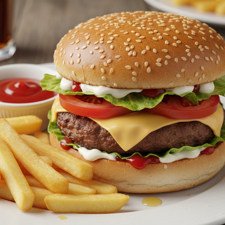 Pan de ajonjolí con carne y tocino, lechuga, tómate, queso amarillo, mayonesa, cátsup y pequeña porción de papas naturales fritas.