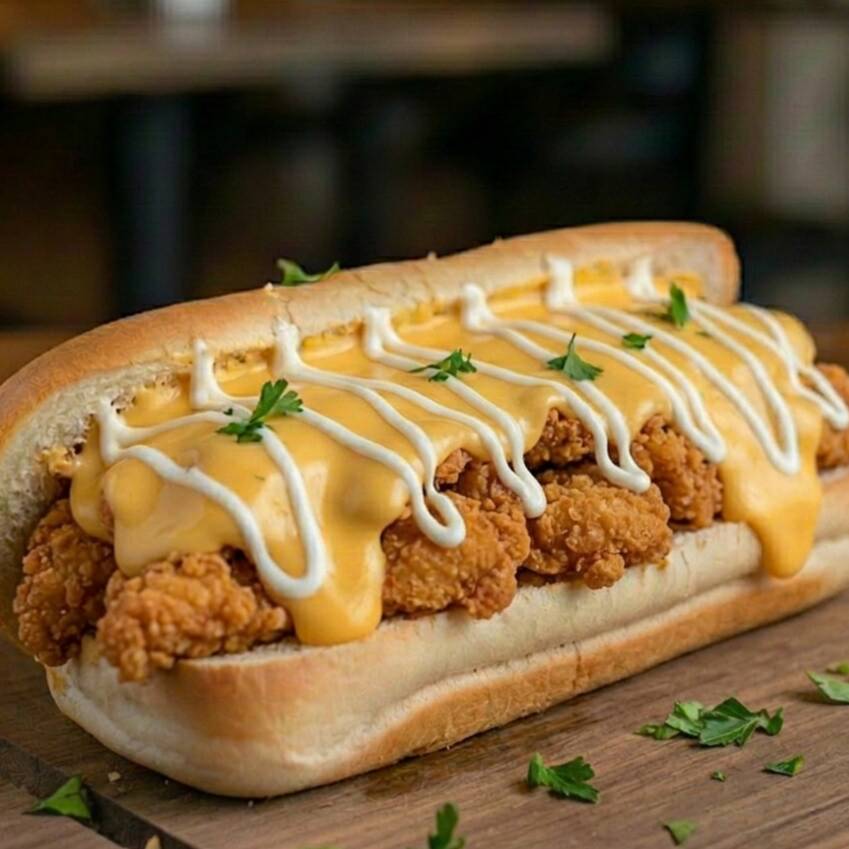 Pan de hot dog con boneless queso amarillo y ranch