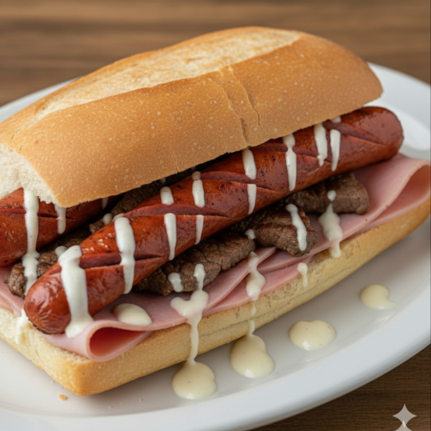 Pan de telera con salchicha polaca y carne de Aracherra, jamón, aderezo ranch.