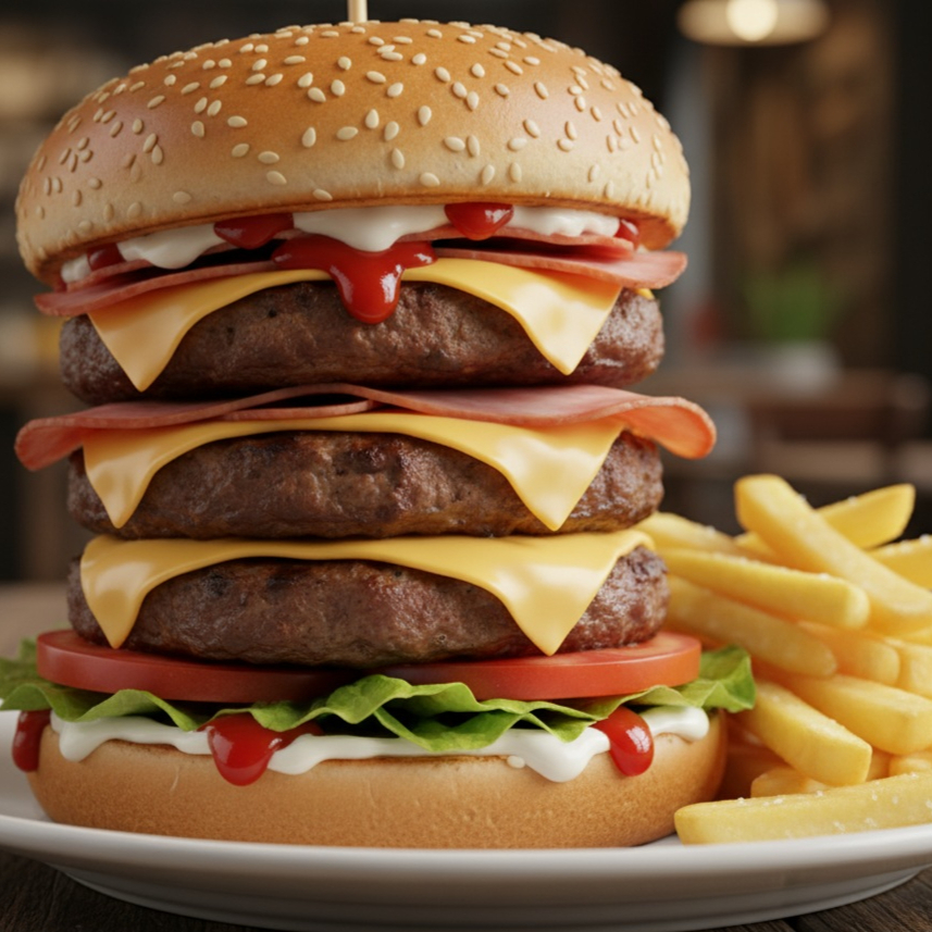 Pan de ajonjolí con 3 carnes, queso amarillo, jamón, lechuga, tómate,mayonesa, cátsup.