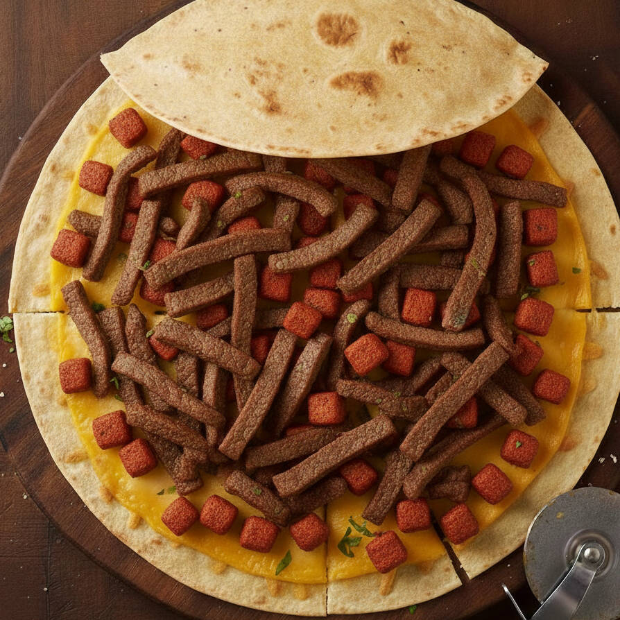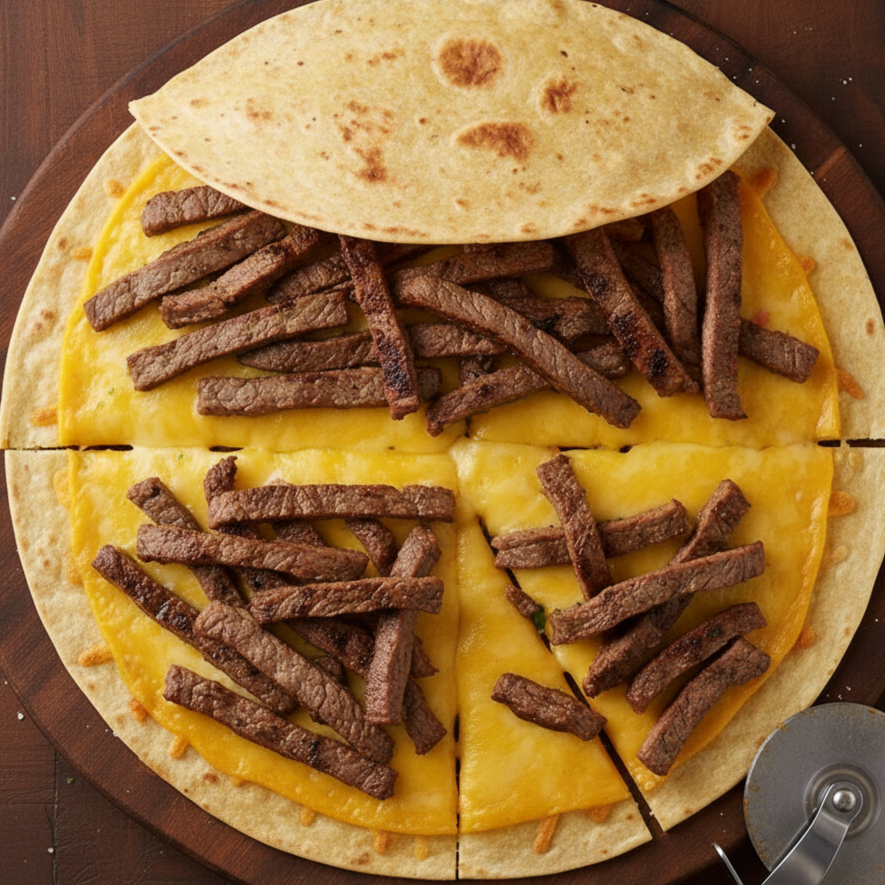 Tortilla de harina, con carne queso y otra tortilla de harina.