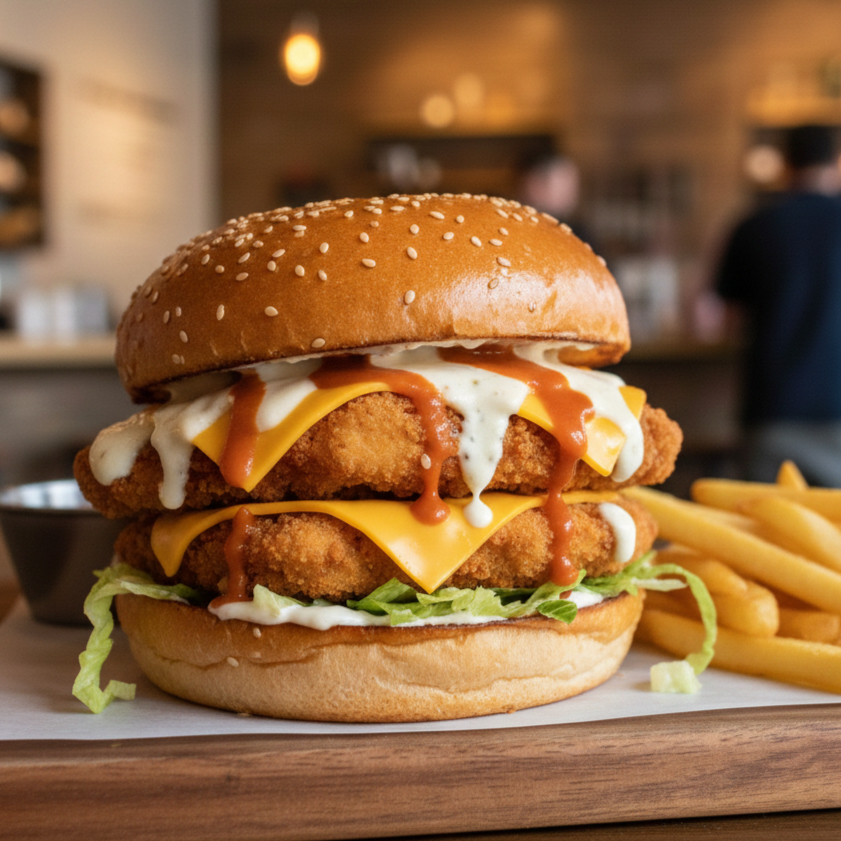 Pan de Hamburguesa con Boneless, lechuga, queso amarillo, ranch.