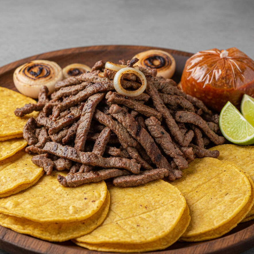 Kilo crudo de bistec cocido a la plancha incluye; limón, salsa, cebolla asada y 10 tortillas.