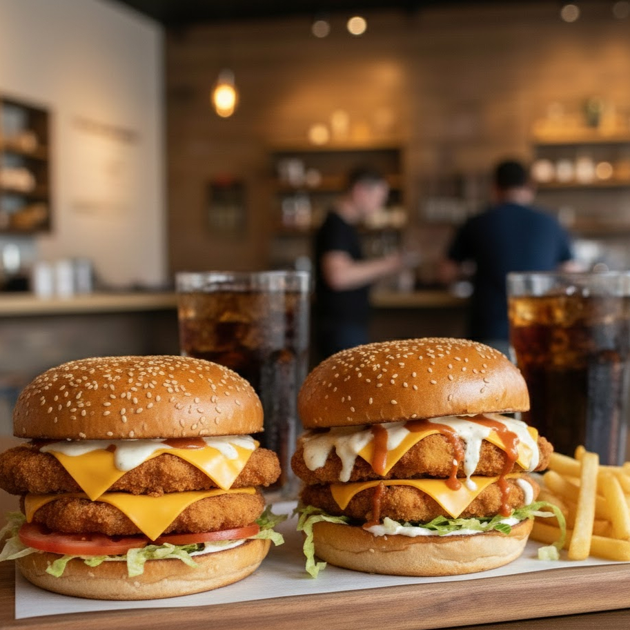 2 hamburgesas, Pan de Hamburguesa con boneless, lechuga, queso amarillo, ranch.