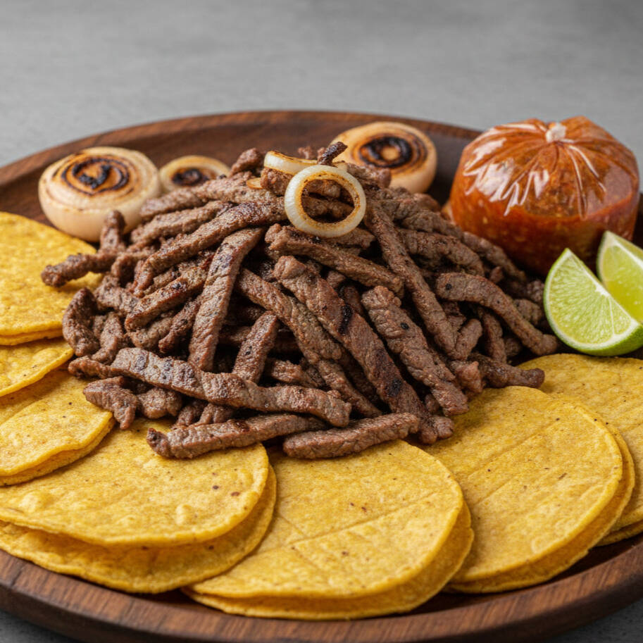Un kilo de arrachera cruda cocida a la plancha con 10 tortillas limon y salsa.