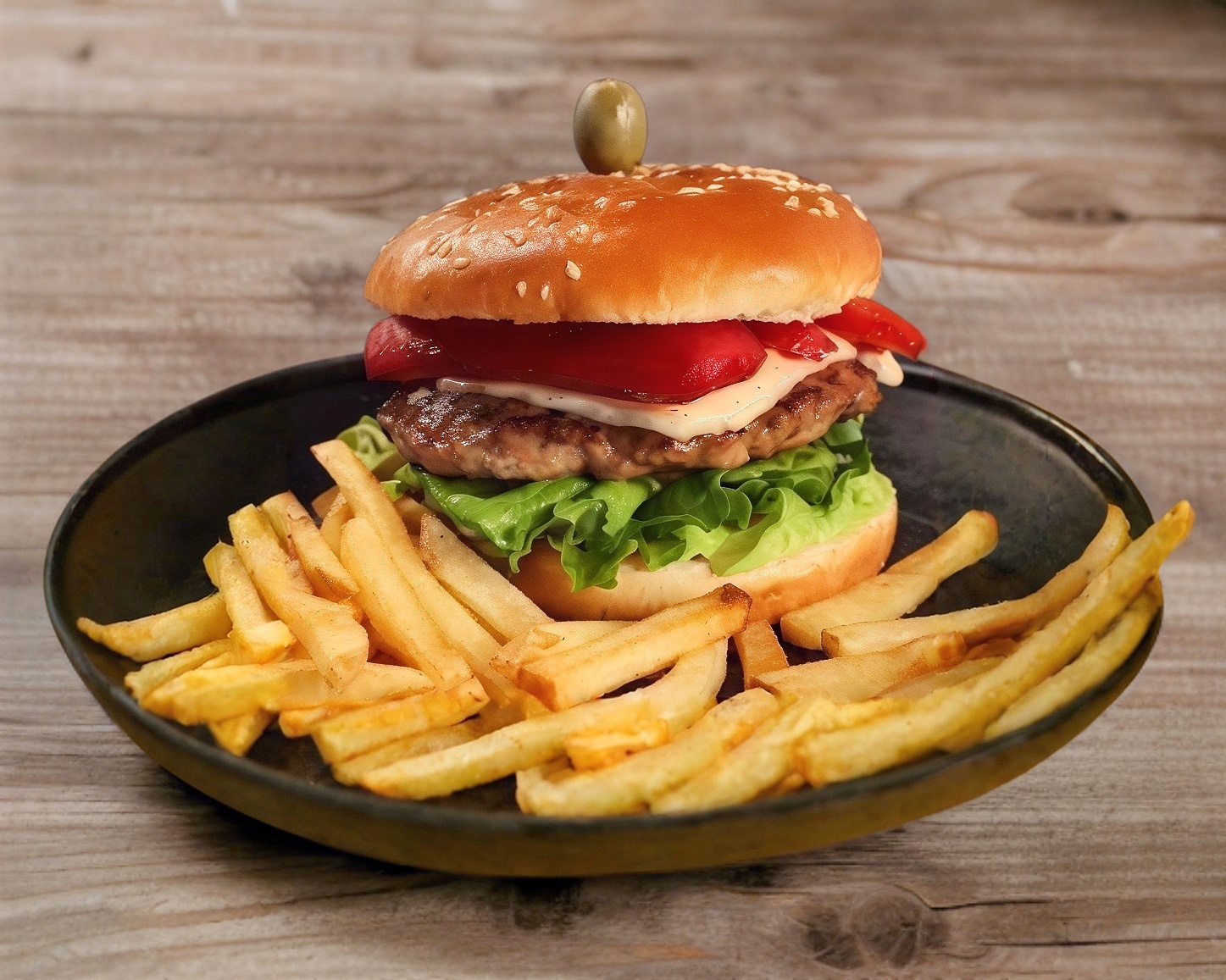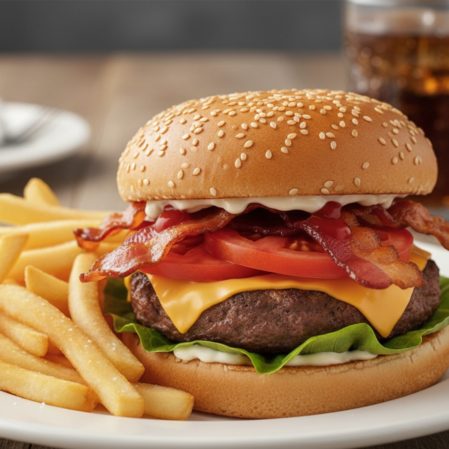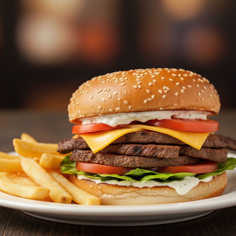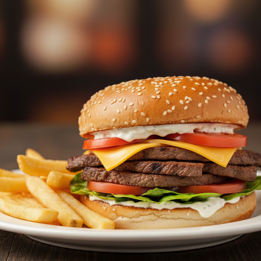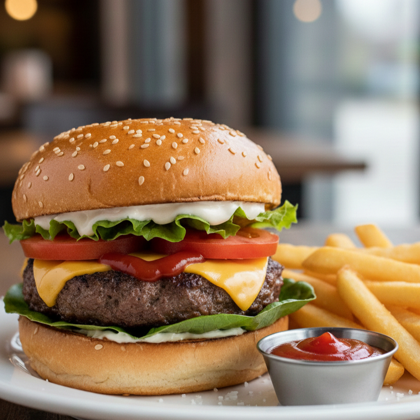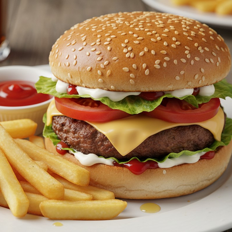 Pan de ajonjolí carne sencilla con lechuga, tomate, mayonesa, cátsup, queso amarillo y pequeña porción de papas naturales a la francesa fritas.