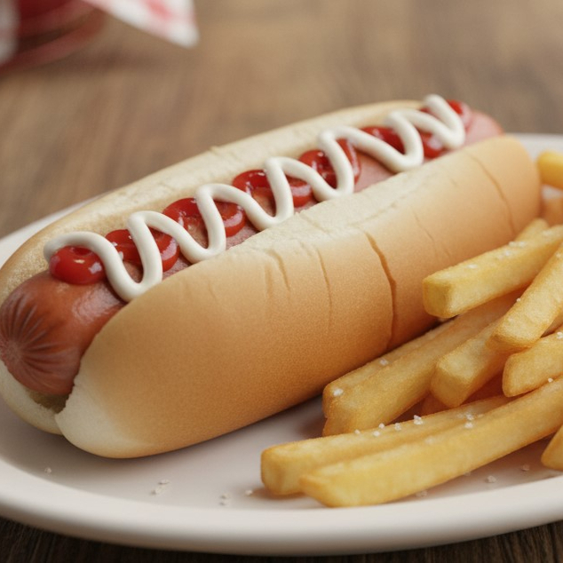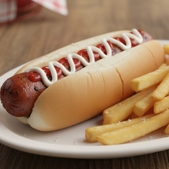 Pan de hot dog con salchicha mayonesa, cátsup y pequeña porción de papas naturales fritas a la francesa.