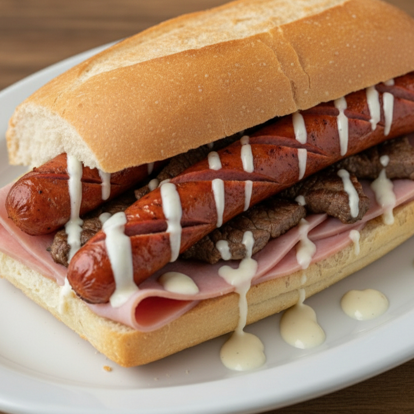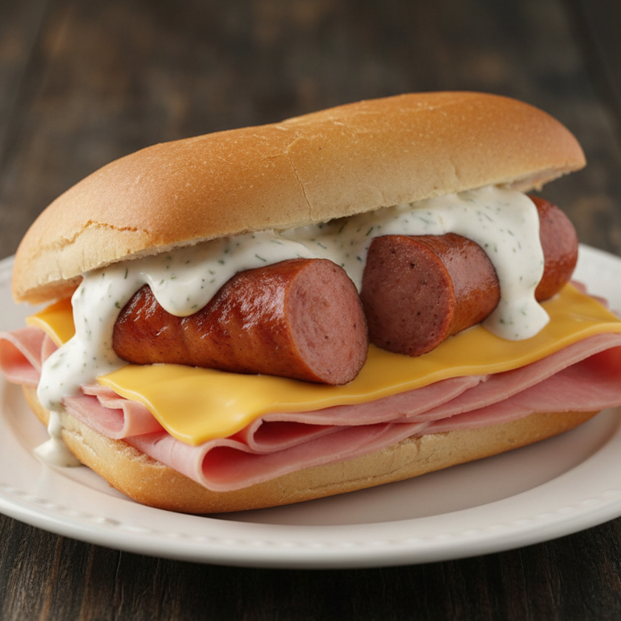 Pan de Telera jamón y salchicha polaca con aderezo ranch.