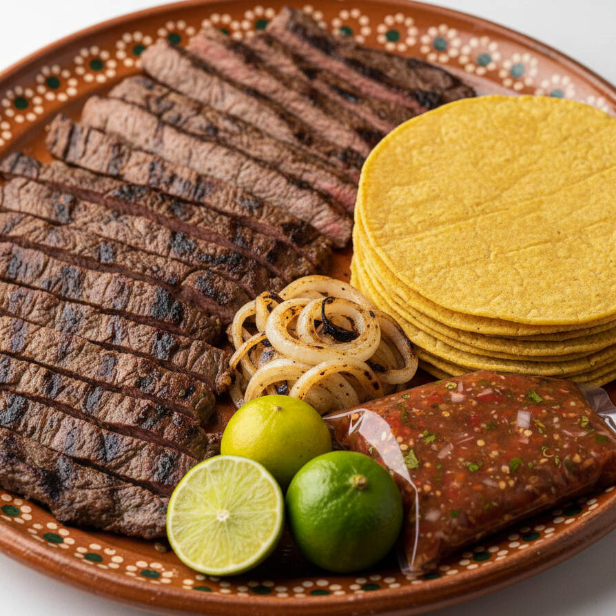 Un kilo crudo de carne de bistec cocida a la plancha con cortesía de regalo bajo existencia 10 tortillas, salsa, limones y cebolla asada.