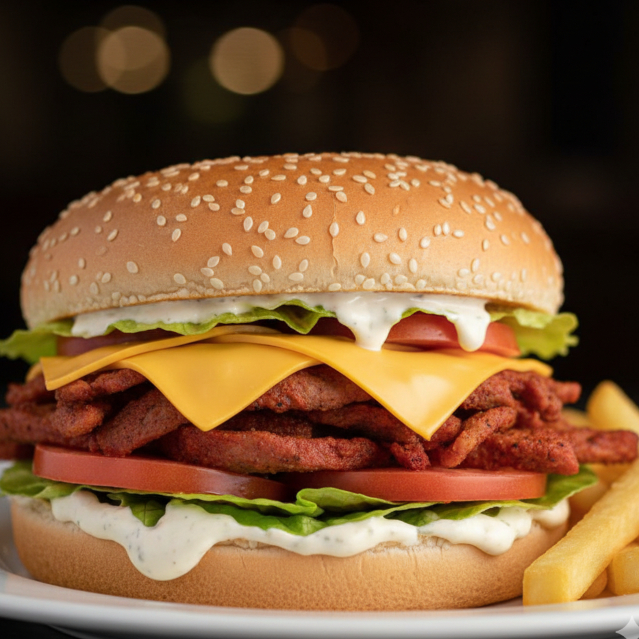 Pan de Ajonjolí con carne de trompo, aderezo ranch, lechuga, tómate, queso amarillo, y pequeña porción de papas naturales fritas a la francesa.