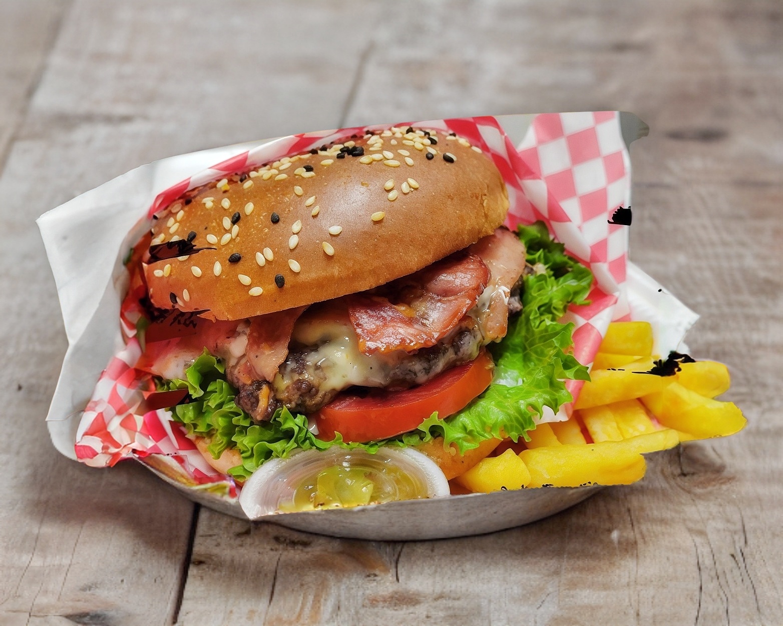 PAN ARTESANAL ,CARNE CASERA 100% RES ,QUESO AMARILLO,QUESO BLANCO,JAMON,SALAMI,CATSUP,MAYONESA,ADEREZO DE LA CASA,LECHUGA,TOMATE, CEBOLLA Y PEPINILLOS