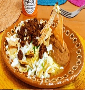 Chilaquiles de Carne Asada incluye totopos de maiz salsa verde o roja queso oaxaca crema complemento frijoles y cebolla viene aparte