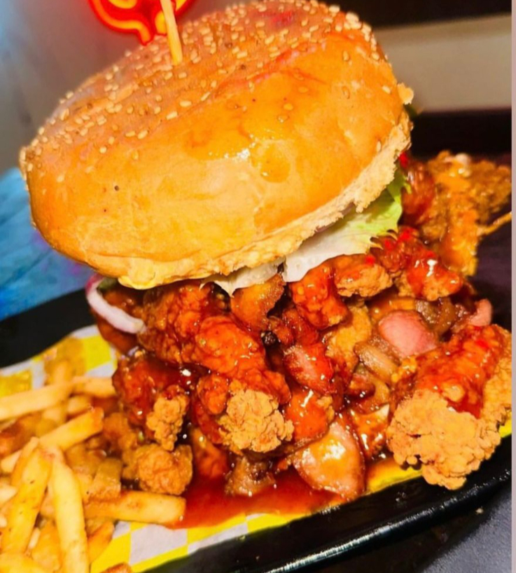 Deliciosa hamburguesa de pechuga empanizada, pan brioche, tocino, queso chihuahua, queso amarillo, jitomate, cebolla, lechuga orejona, pepinillos, Sr. Aderezo y una salsa a elegir.