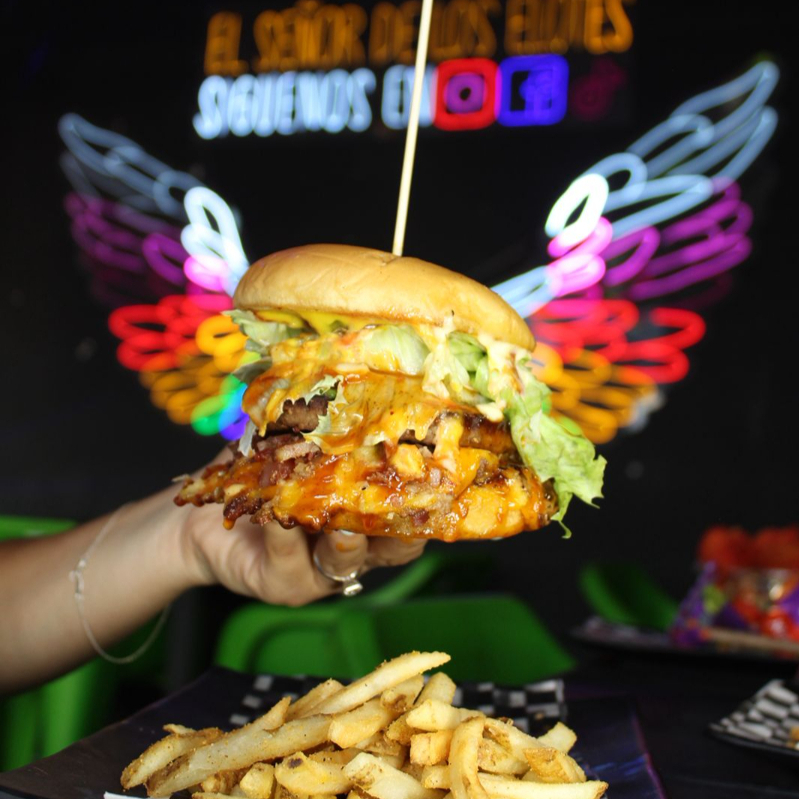 Deliciosa hamburguesa de carne de res, pan brioche, tocino, queso chihuahua, queso amarillo, jitomate, cebolla, lechuga orejona, pepinillos, Sr. Aderezo y una salsa a elegir.