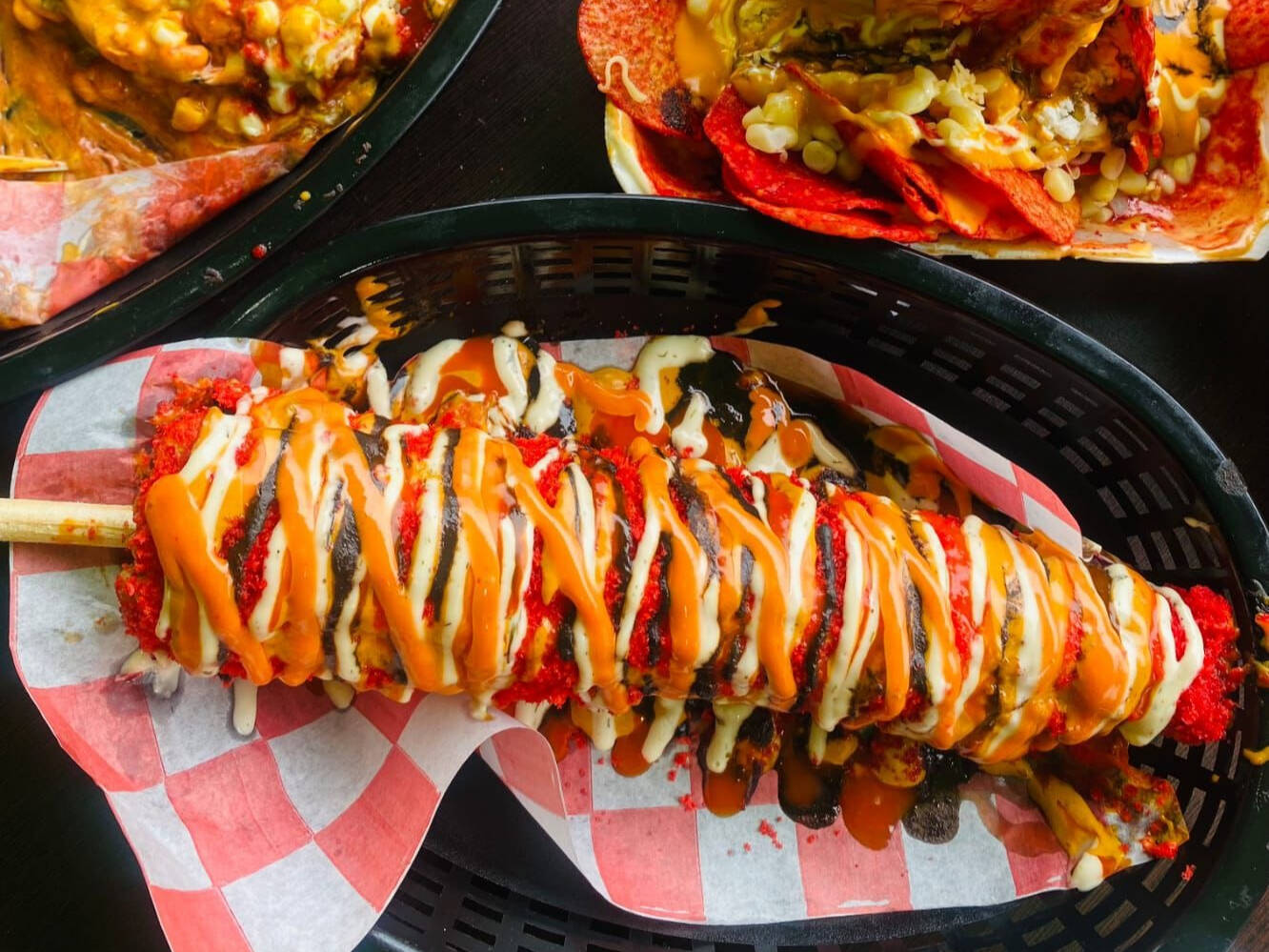 Elote entero bañado en 2 salsa de tu preferencia y decorado con ranch o bluechesse