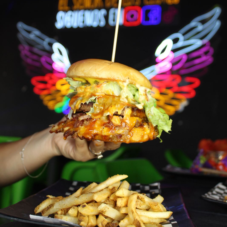 Deliciosa hamburguesa de carne de res, pan brioche, tocino, queso chihuahua, queso amarillo, jitomate, cebolla, lechuga orejona, pepinillos, Sr. Aderezo y una salsa a elegir.