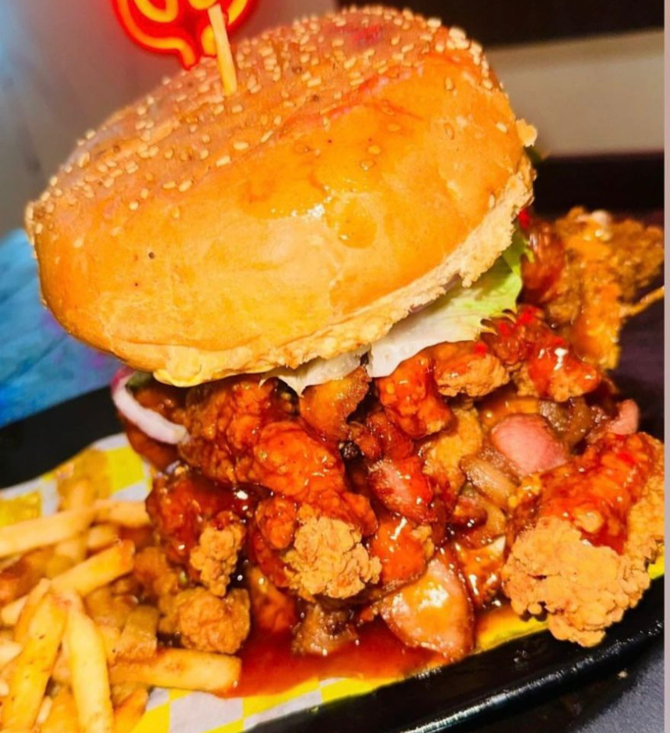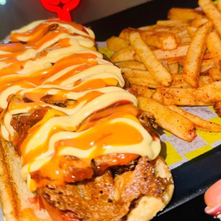 Deliciosa hamburguesa de pechuga empanizada, pan brioche, tocino, queso chihuahua, queso amarillo, jitomate, cebolla, lechuga orejona, pepinillos, Sr. Aderezo y una salsa a elegir.