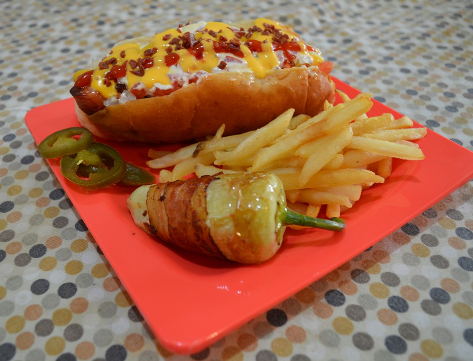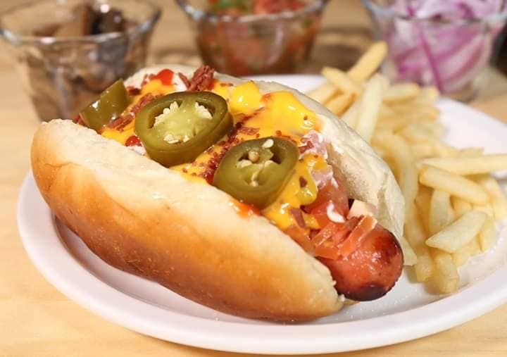 Salchicha de 20 cm. de 150 gr. envuelta en tocino, cebollita asada y cruda, tomate, mayonesa, mostaza, cátsup, queso amarillo y blanco, tocinito picado, jalapeño, pepinillos.