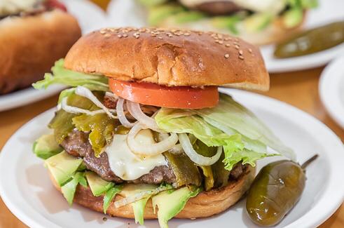 Carne de top sirloin, queso amarillo, lechuga, tomate, aguacate, mayonesa, mostaza y cátsup.