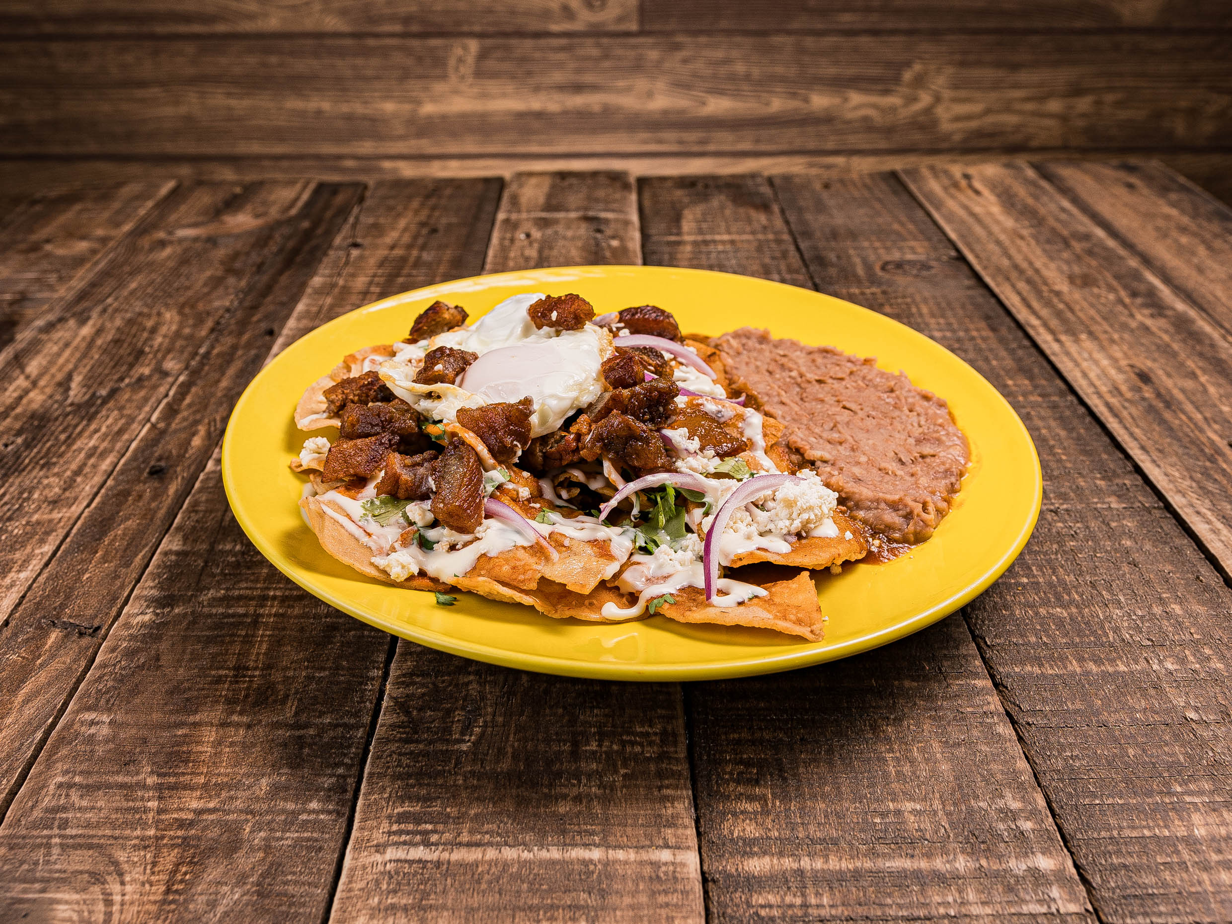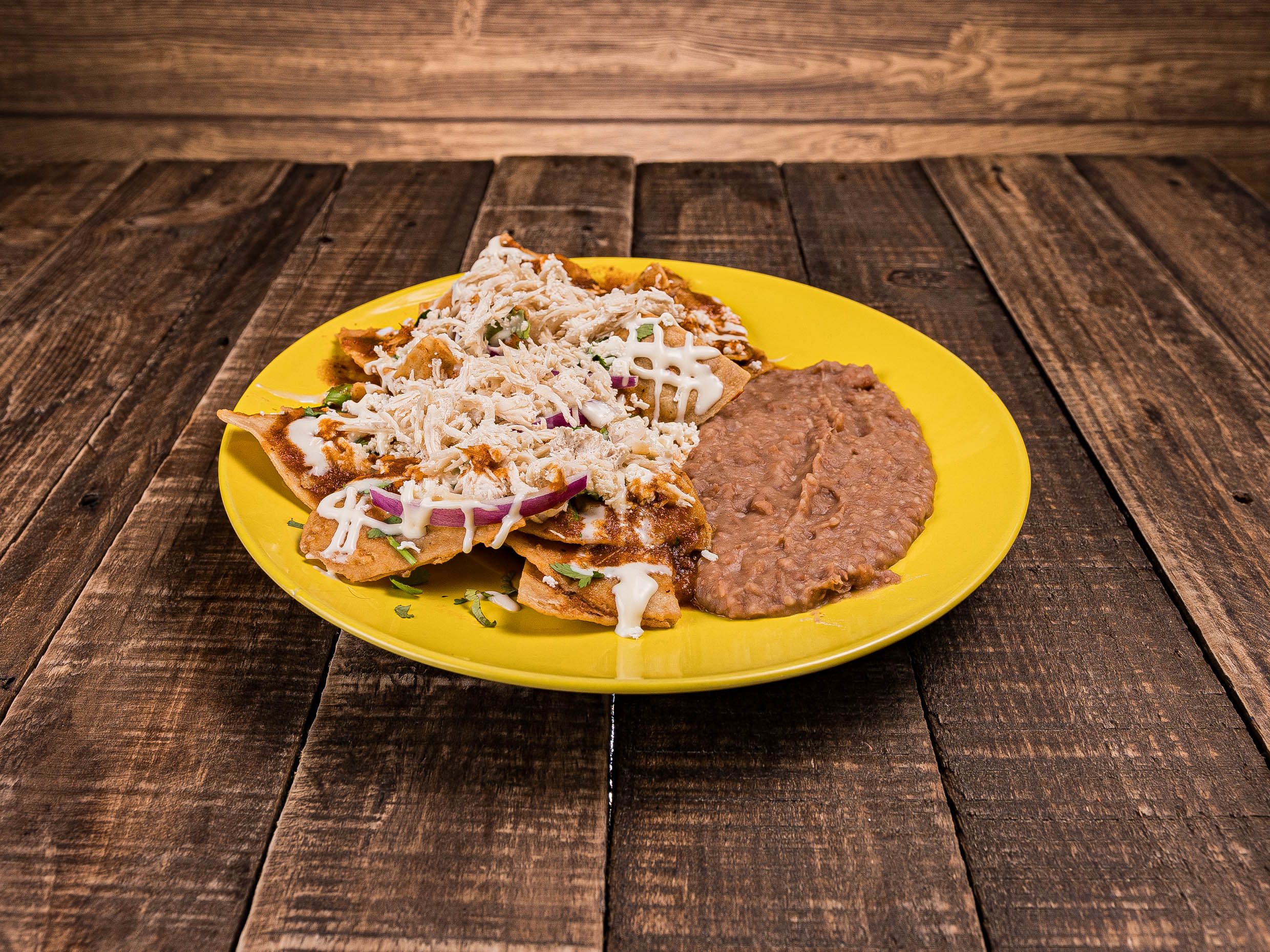 Deliciosos chilaquiles con salsa Roja, servidos con crema, queso, frijoles y cebolla... acompáñalos con huevo, pollo o chicharrones de "La Ramos" (precio extra).