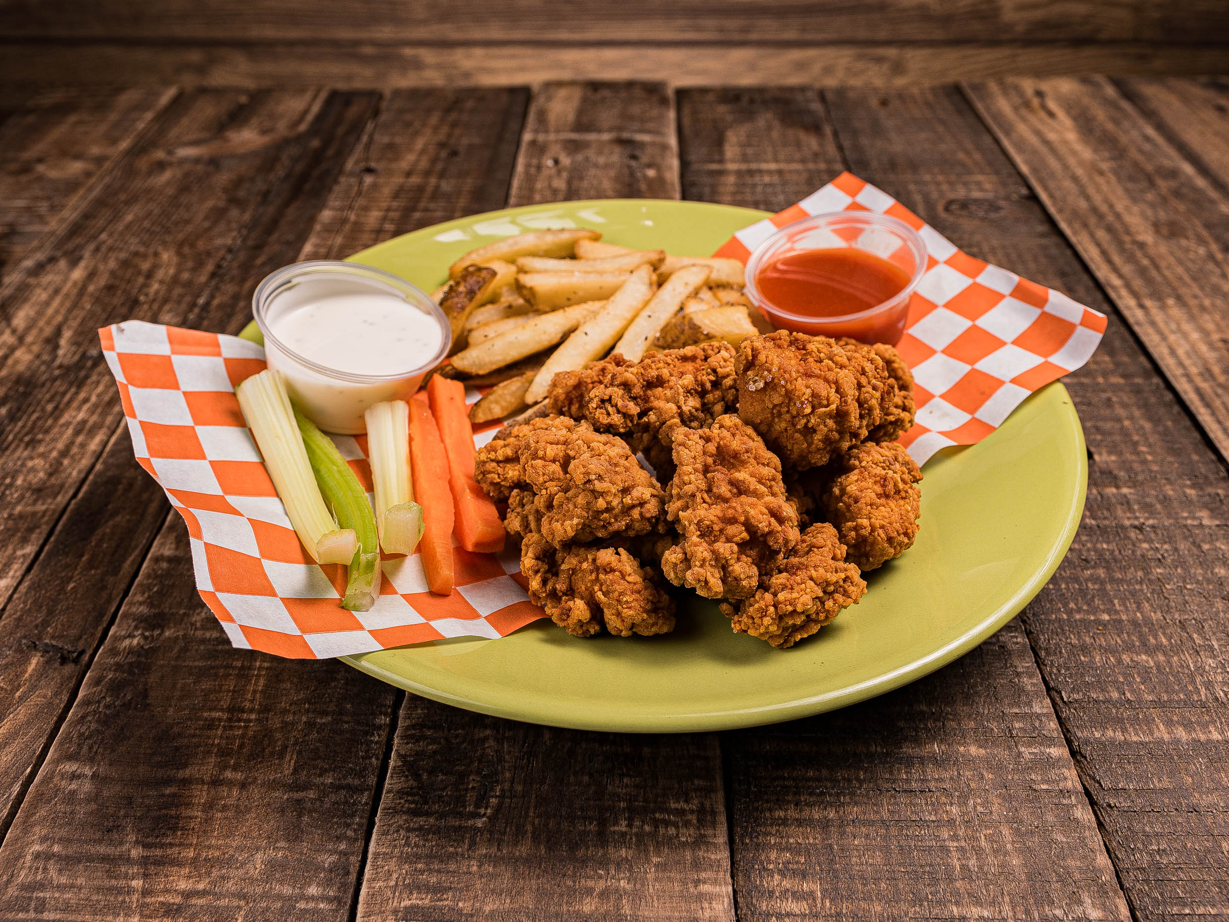 (Aprox. 250 gr )Deliciosos boneless (6 A 7 PZS) bañados en tú salsa favorita, acompañados con bastones de apio y zanahoria y papas 250 gr