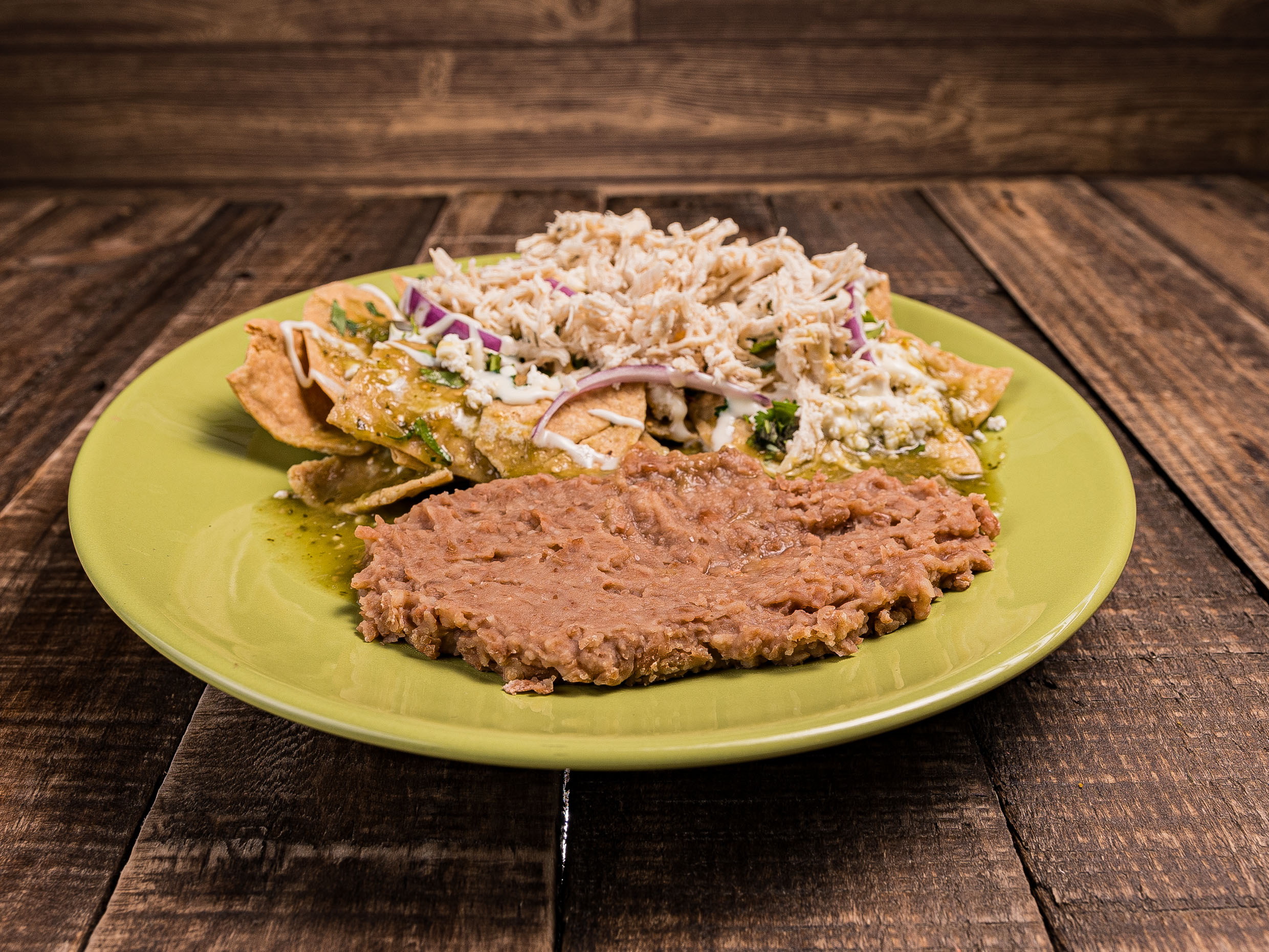 Deliciosos chilaquiles Verdes, servidos con crema, queso, frijoles y cebolla... acompáñalos con huevo, pollo o chicharrones de "La Ramos" (precio extra).