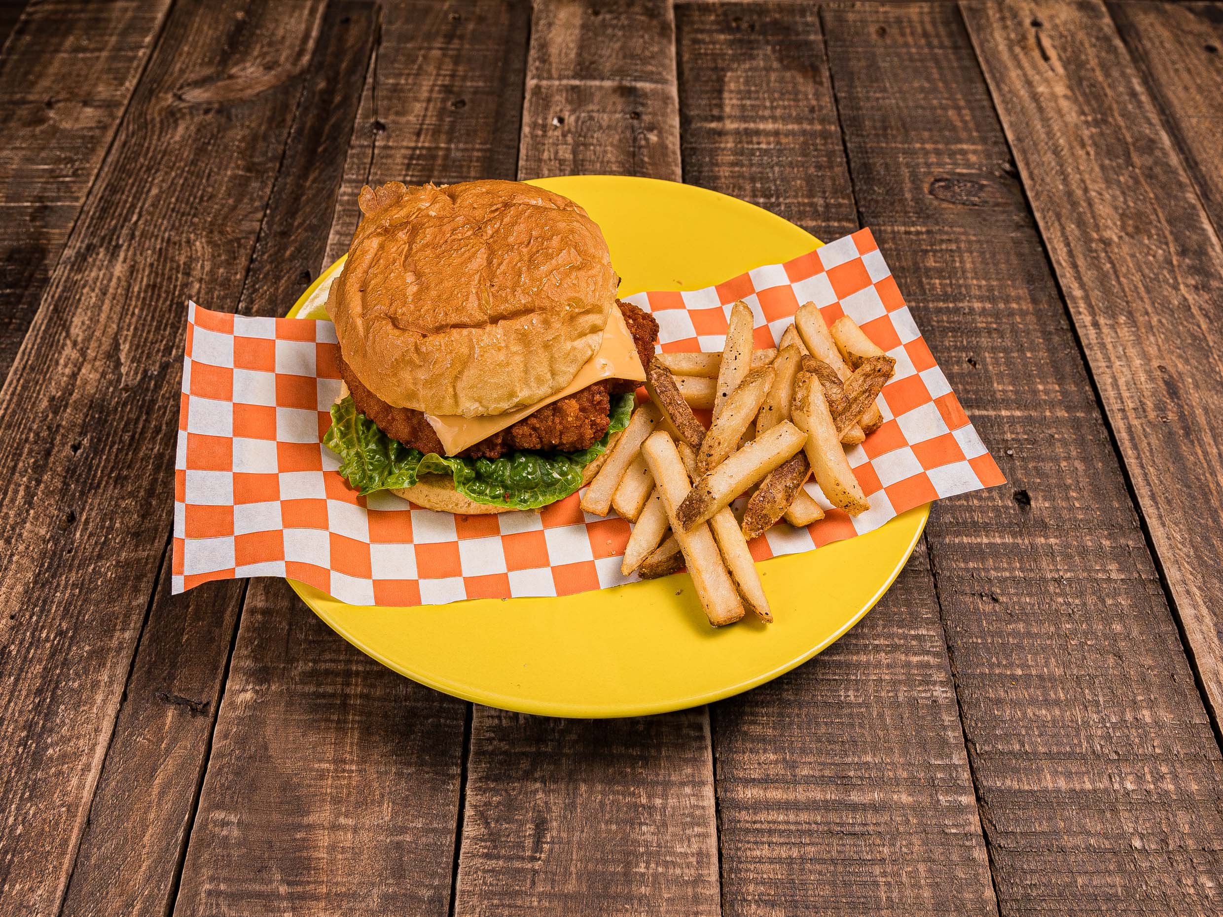 Servida en pan calientito y 150 gr de pollo crispy, queso amarillo, lechuga, tomate y cebolla, aderezada con mayonesa y mostaza. Acompañada con 200 gr de papas a la francesa natura
