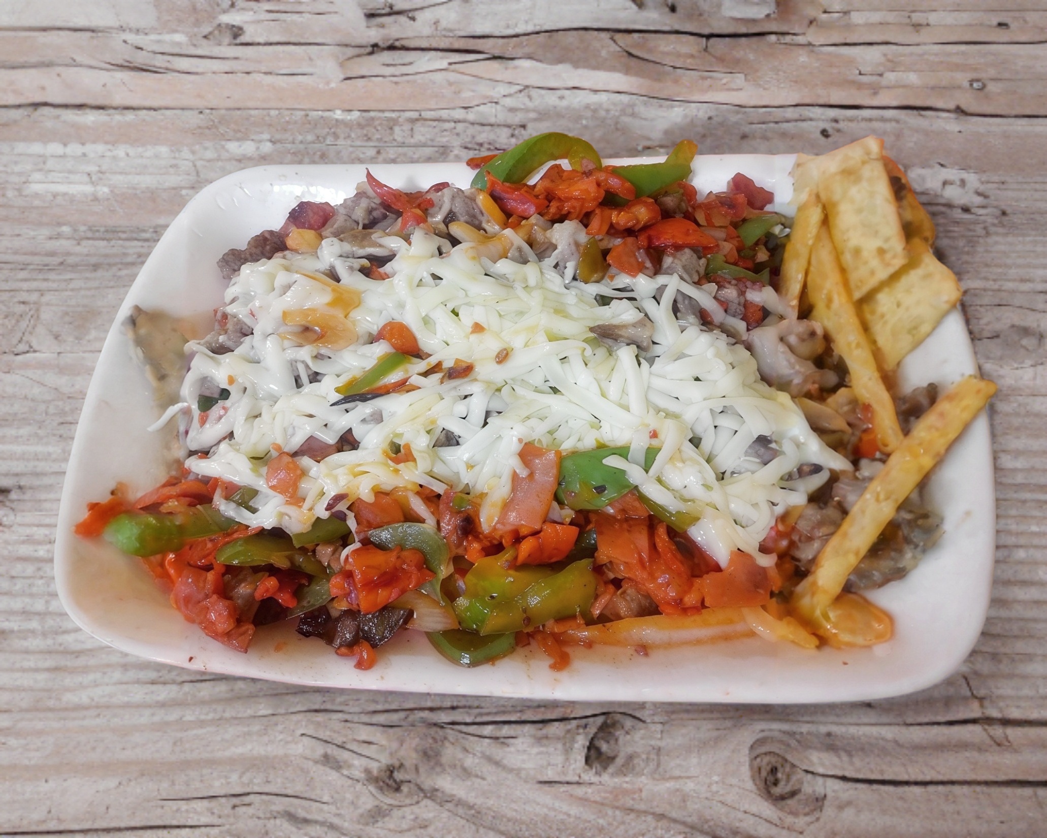 Cebolla, chile morrón, jitomate, chorizo, carne de bistec, queso asadero, huevo estrellado, tortillas, limones, salsas.