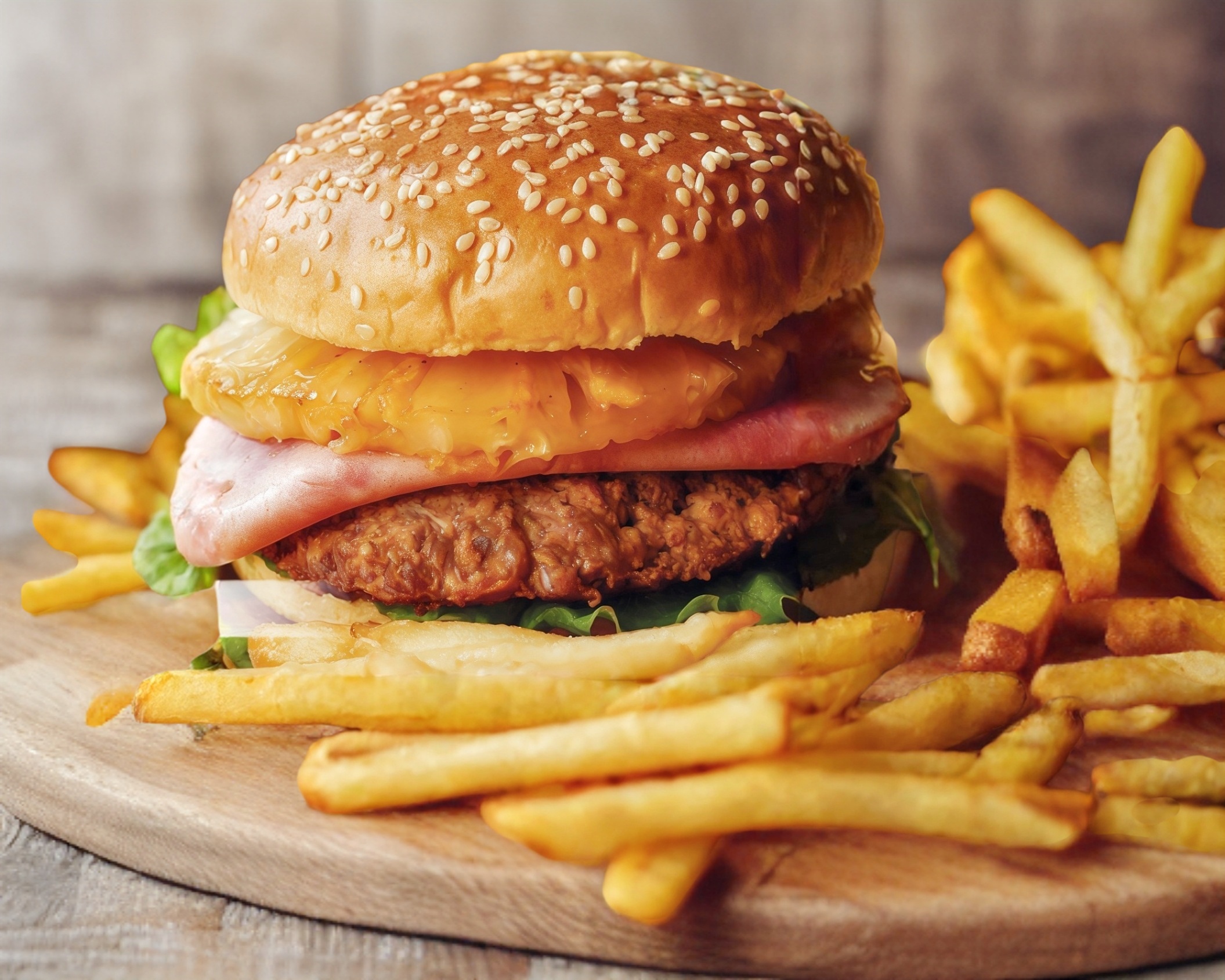 Carne de hamburguesa 100% casera, conjamon, queso amarillo, queso asadero,una rebanada piña miel ,en pan de margarita con ajonjoli , agucate y lechuga