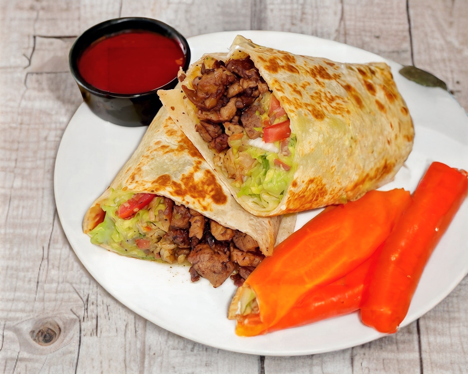 Tortilla de Harina, Frijoles, Lechuga, Aguacate,Queso Asadero, Trompo, Bistec,Acompañado con Papa Galeana.